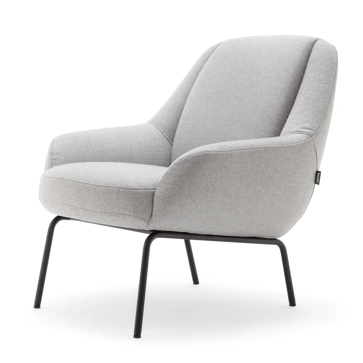 Le fauteuil d'une hauteur d'assise de 44 cm se compose d'une structure en tube d'acier rond à quatre pieds, revêtue de poudre. Sellerie souple avec accoudoirs pour plus de confort. Le rembourrage en différentes couleurs et matériaux rend le fauteuil personnalisable, ce qui le rend idéal pour toutes les ambiances.