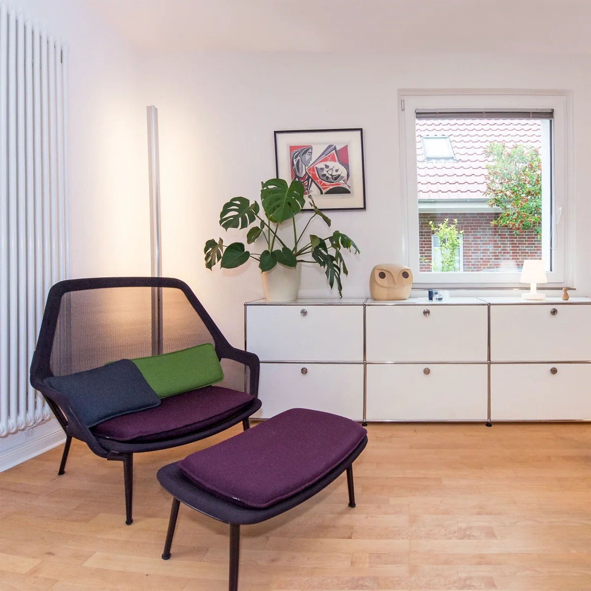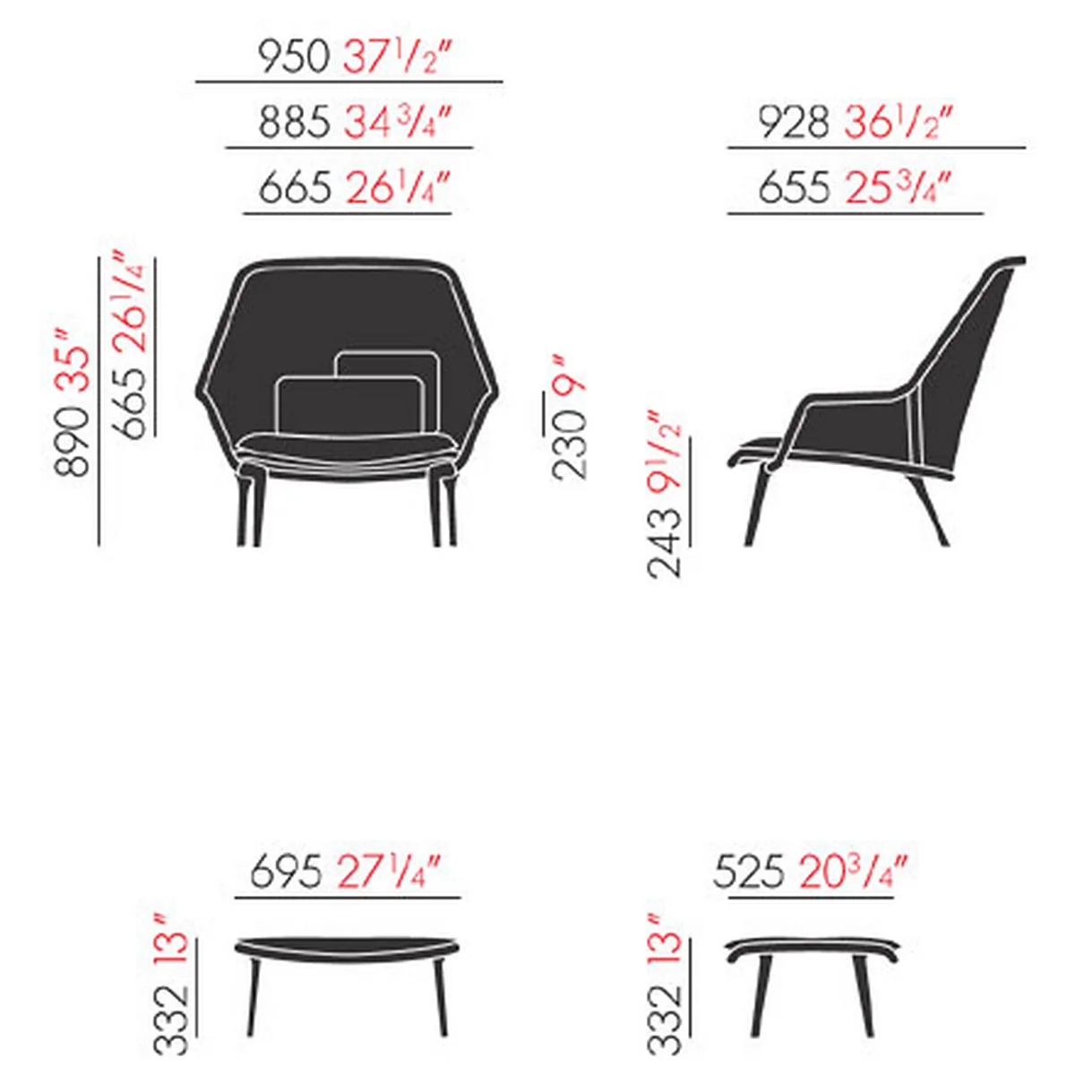 Vitra produit le Slow Chair & Ottoman d’un cadre tubulaire en acier avec pieds en aluminium. Trois coussins de couleurs assorties sont inclus dans la livraison.