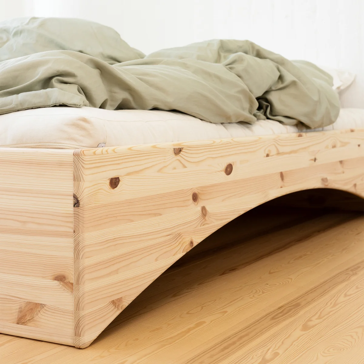 L'arrondi caractéristique confère au design une légèreté et une élégance sculpturale. Derrière cette forme harmonieuse se cache une fonction bien pensée : des lattes rabattables permettent d'utiliser facilement l'espace de rangement sous le lit - pratique et discret à la fois. Chaque ligne et chaque raccord sont soigneusement conçus pour créer de la stabilité, du confort et un équilibre naturel.