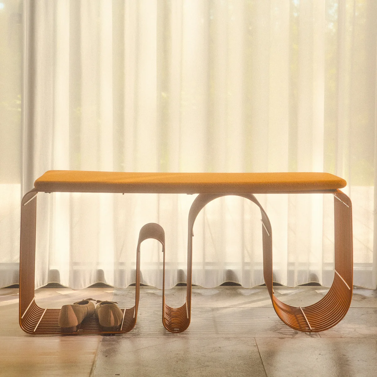 Grâce à sa polyvalence, le banc Curva convient aussi bien comme siège dans l'entrée ou la chambre à coucher que comme table d'appoint dans le salon. Il peut également servir de surface de présentation pour des livres ou des objets décoratifs. Son design aéré s'intègre facilement dans différents styles d'aménagement et apporte toujours une touche particulière.