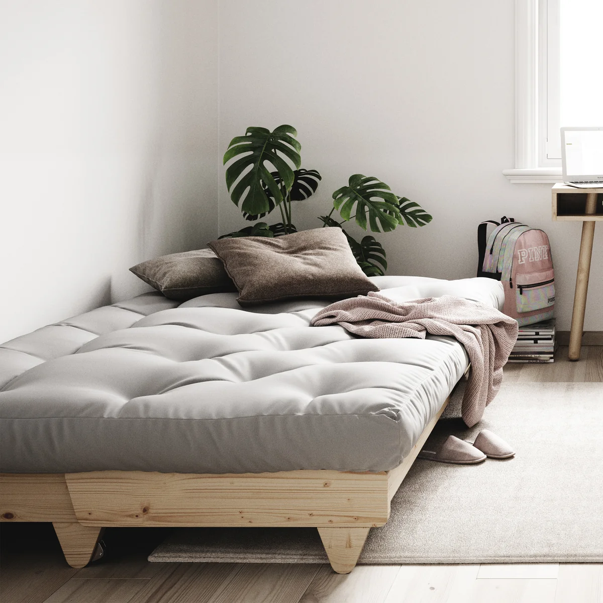 Le canapé est composé d'un cadre en bois de pin et la housse du futon est en coton et polyester.