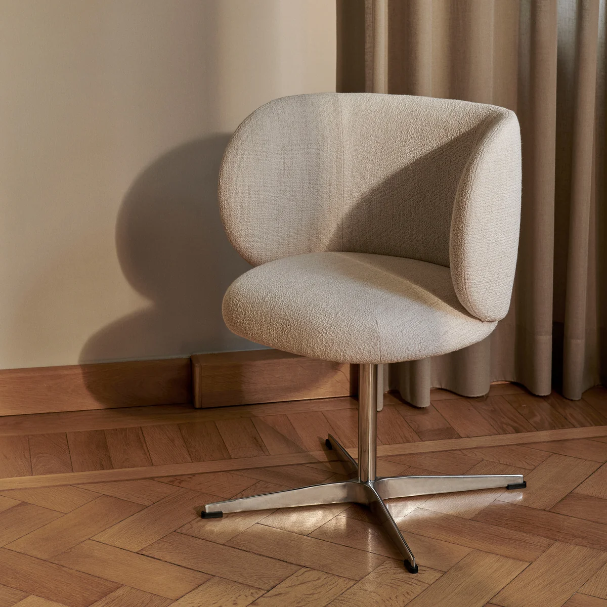 La chaise Rico Dining Chair (pivotante) de la maison Ferm Living séduit par ses superbes courbes et son volume voluptueux. Les lignes douces de la chaise lui confèrent une expression conviviale et enveloppante. Le piètement rotatif fonctionnel en aluminium offre la base robuste et pivotante de la chaise, tandis que l'assise en mousse moulée est recouverte de bouclé (35% acrylique, 24% polyester, 19% viscose, 14% coton, 5% lin et 3% autres fibres) ou de Hallingdal de Kvadrat (70% laine vierge et 30% viscose). Rico peut être merveilleusement placé à la table de la salle à manger ou utilisé comme chaise de bureau élégante dans le bureau.