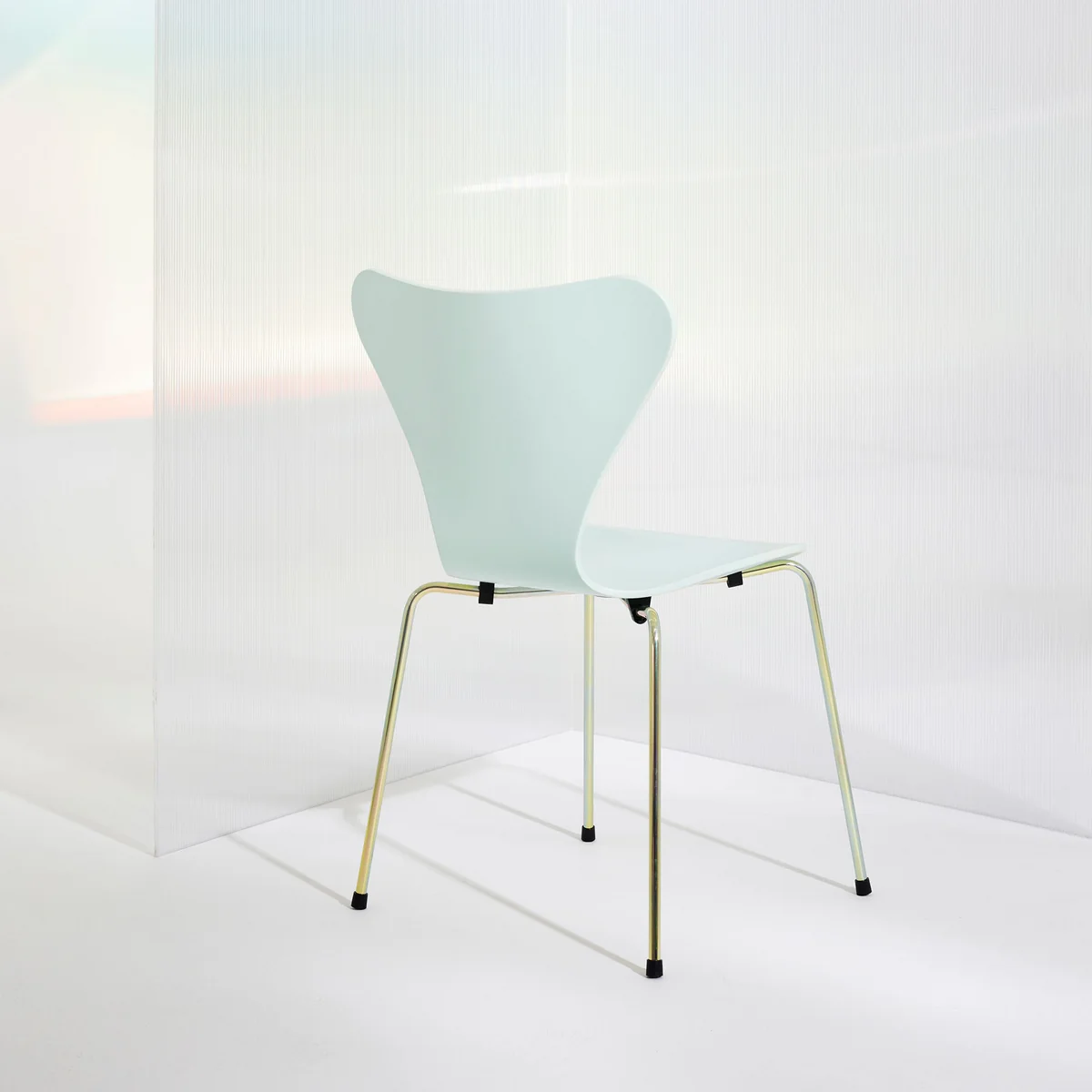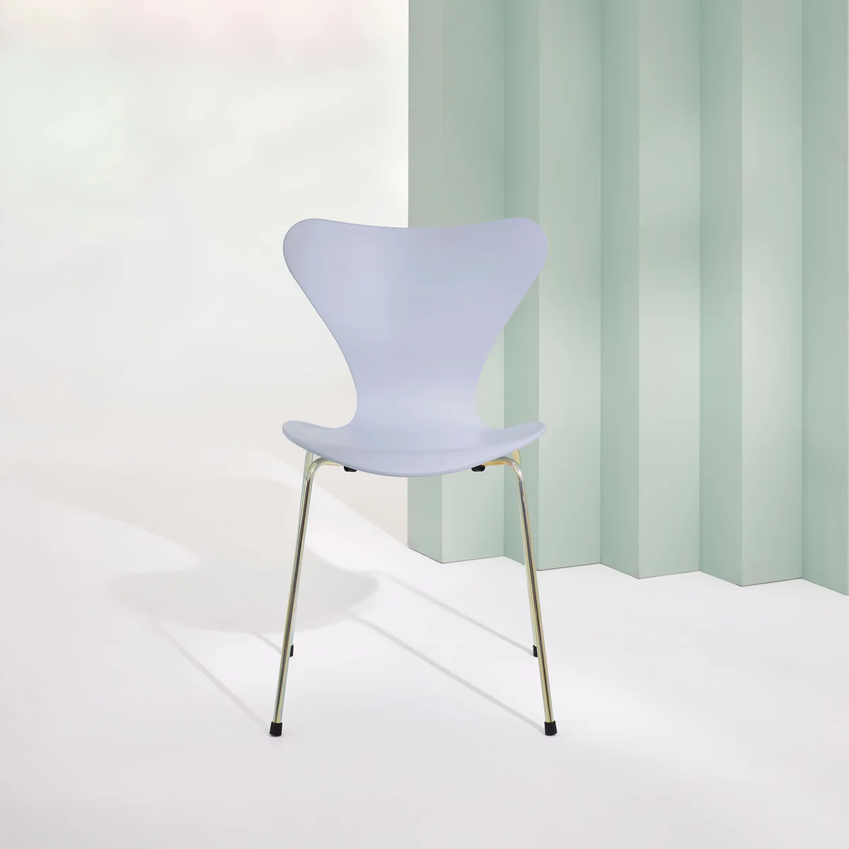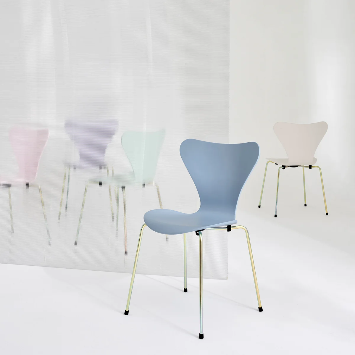 L'édition spéciale de cette chaise Série 7 capture la douce beauté de la lumière matinale danoise et donne à l'emblématique chaise Série 7 d'Arne Jacobsen une nouvelle palette de couleurs poétiques. Les cinq tons délicats (disponibles en vert, beige, rose, violet et bleu) reflètent les couleurs d'un matin d'automne et sont associés à un piètement Rainbow. Ces nuances subtiles créent une atmosphère calme et harmonieuse et se combinent sans peine aussi bien avec la palette de couleurs existante Fritz Hansen qu'entre elles.