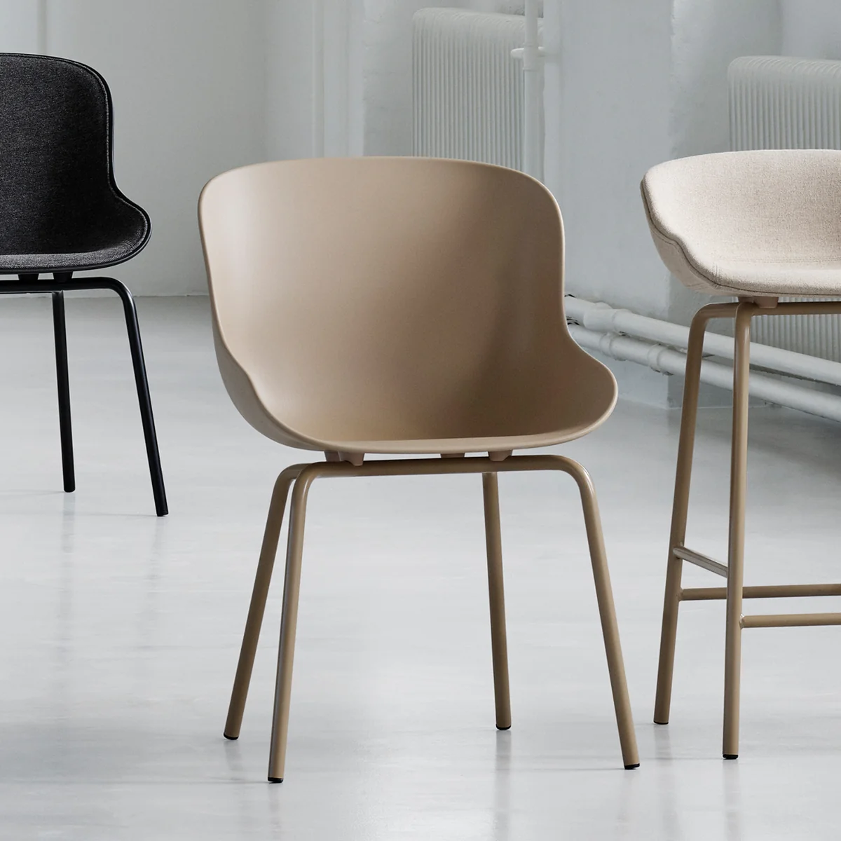 La chaise se compose d'un cadre à quatre pieds en acier peint par poudrage et d'une coque d'assise en polypropylène. Les deux parties sont peintes de la même couleur, ce qui donne à la chaise un aspect particulièrement calme et uniforme. Cette chaise intemporelle est particulièrement adaptée à une table à manger ou à un bureau. Disponible en différentes couleurs, la chaise Hyg s'intègre bien dans différents environnements.