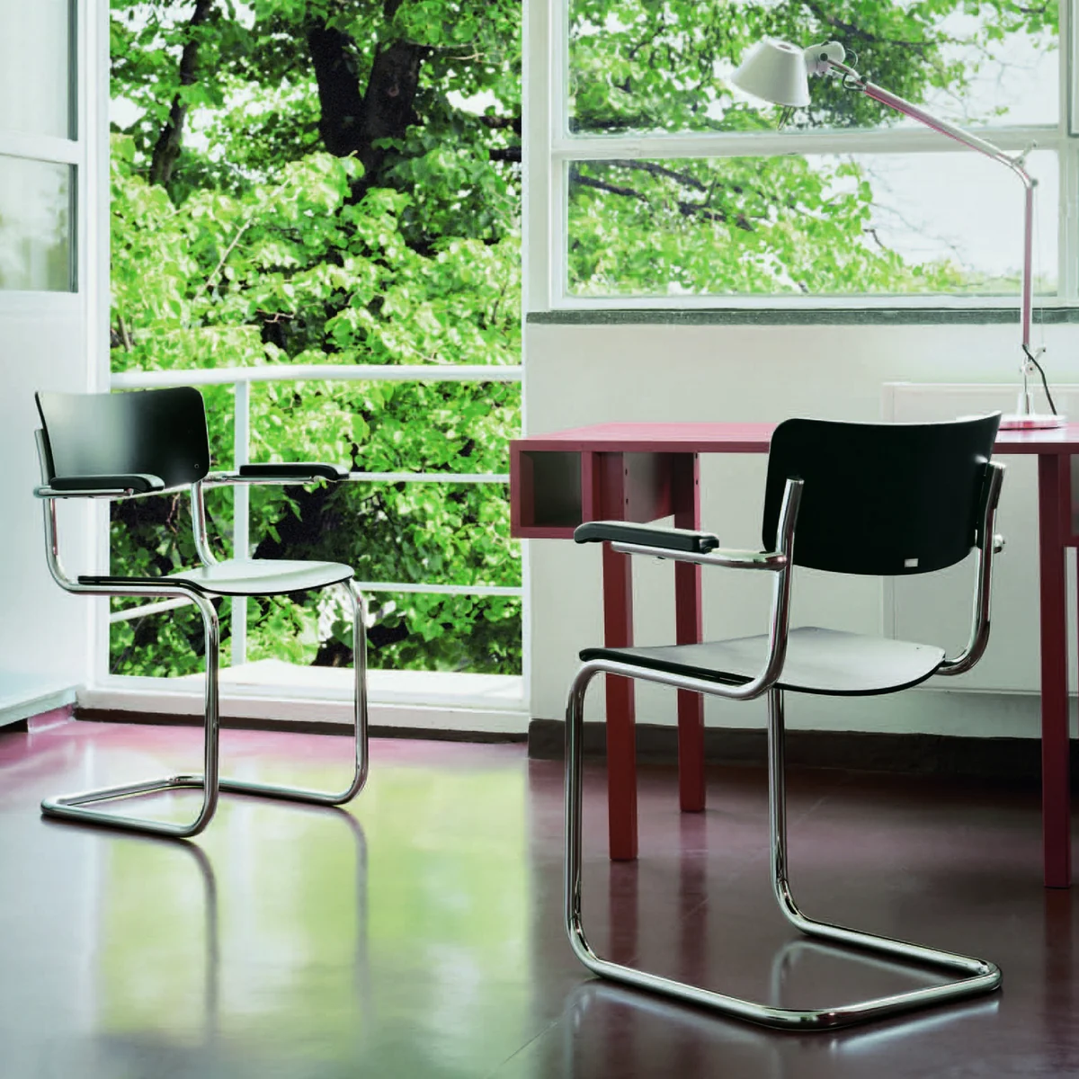 Le fauteuil cantilever a été conçu par Mart Stam en 1931 et est aujourd'hui le classique de la gamme Thonet. Stam combine sur le S 43 F, l’acier tubulaire avec des coques de contre-plaqué moulé et les accoudoirs et crée ainsi une confortable siège cantilever, qui vous invite à la flânerie.