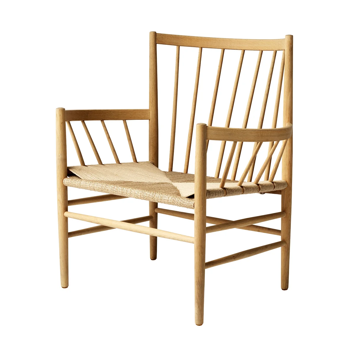 La chaise J82 Lounge Chair est fabriquée en bois massif provenant de forêts européennes. Les entretoises rondes polies en combinaison avec le siège en osier naturel confèrent à la chaise un aspect aéré et léger, qui peut être intégré dans n'importe quelle ambiance de vie. La chaise avec ses accoudoirs ronds vous invite à la lecture et à la détente.