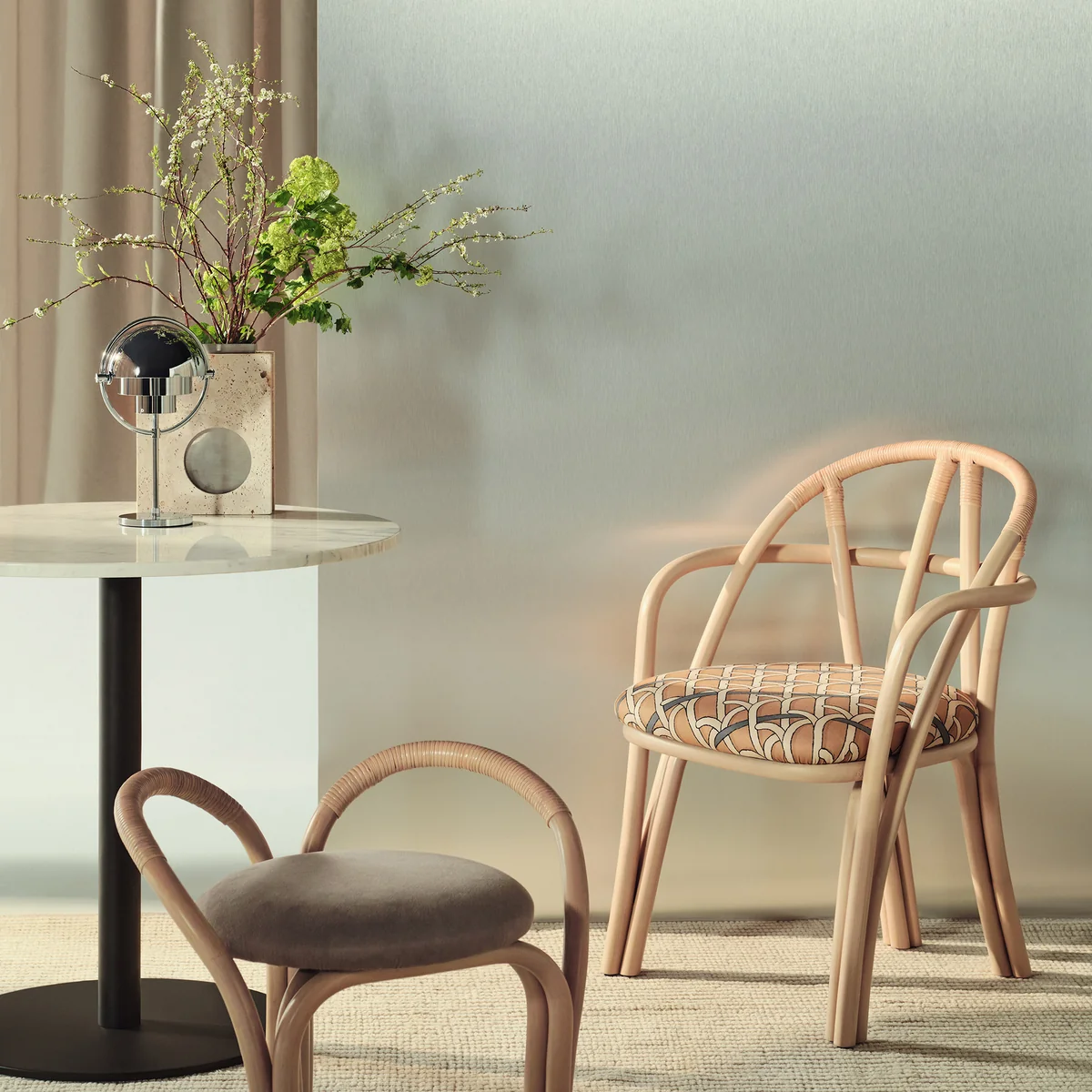 La chaise à accoudoirs Bistra, conçue par AMDL Circle pour GUBI, réinterprète la chaise de bistrot classique. Fabriquée en rotin plié à la vapeur, cette chaise de salle à manger séduit par ses lignes fluides et organiques qui rappellent les structures naturelles des arbres. Les accoudoirs aux courbes douces et le dossier soigneusement travaillé offrent confort et légèreté visuelle. Les coussins spécialement conçus avec un motif botanique - inspiré d'une fresque de Léonard de Vinci - soulignent l'alliance de la nature et du design. Disponible en différents coloris de structure et en différentes variantes de tissu, cette chaise se combine de multiples façons.