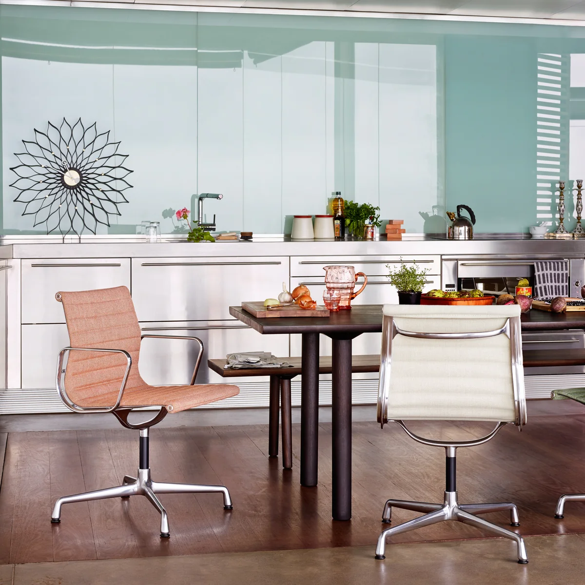Grâce à ces caractéristiques, le siège de bureau EA 103 convient aussi bien aux bureaux qu'aux espaces publics et au secteur privé. La chaise en aluminium EA 103 est idéale pour une utilisation à table : elle est plus étroite que les autres chaises en aluminium, la position assise est plus droite et légèrement plus haute, les accoudoirs sont plus courts. L'EA 103 est idéal pour la salle à manger privée, pour les restaurants ou pour les espaces de réunion au bureau.