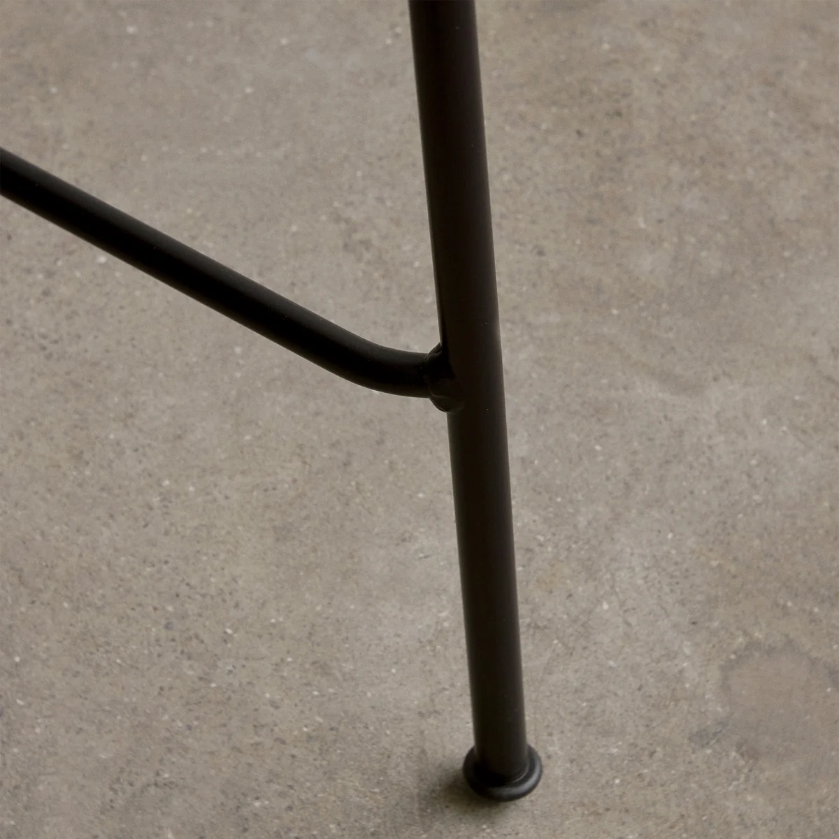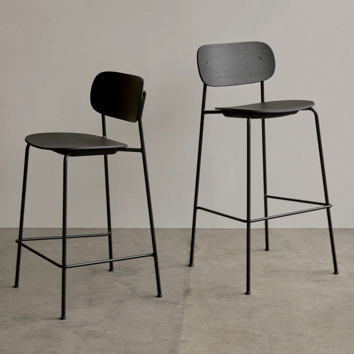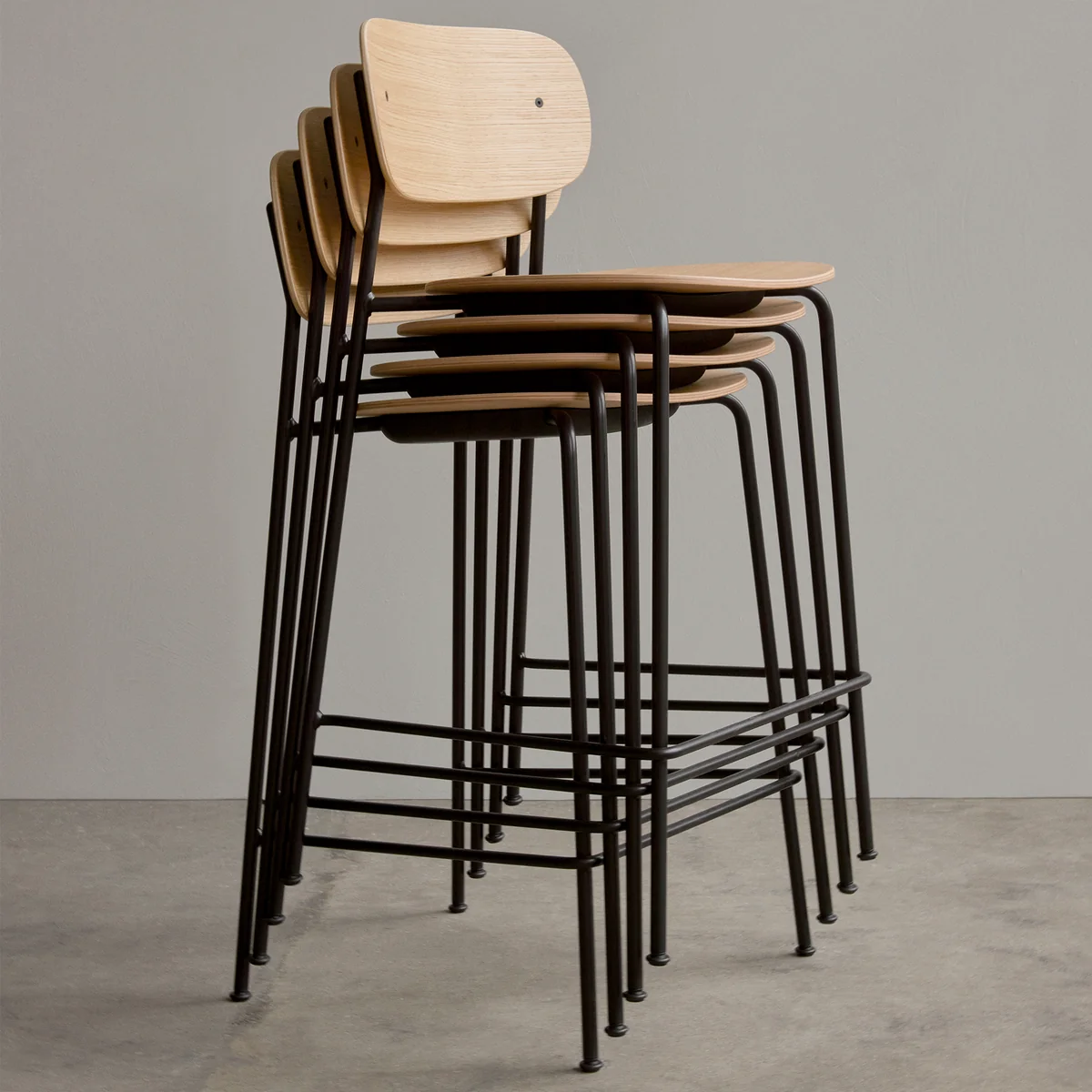 Audo s Co Counter Chair se distingue par le contraste équilibré entre une assise en bois aux courbes douces et un piètement élancé en tube d'acier. Le dossier est légèrement incliné et crée ainsi un soutien et un confort d'assise optimaux.