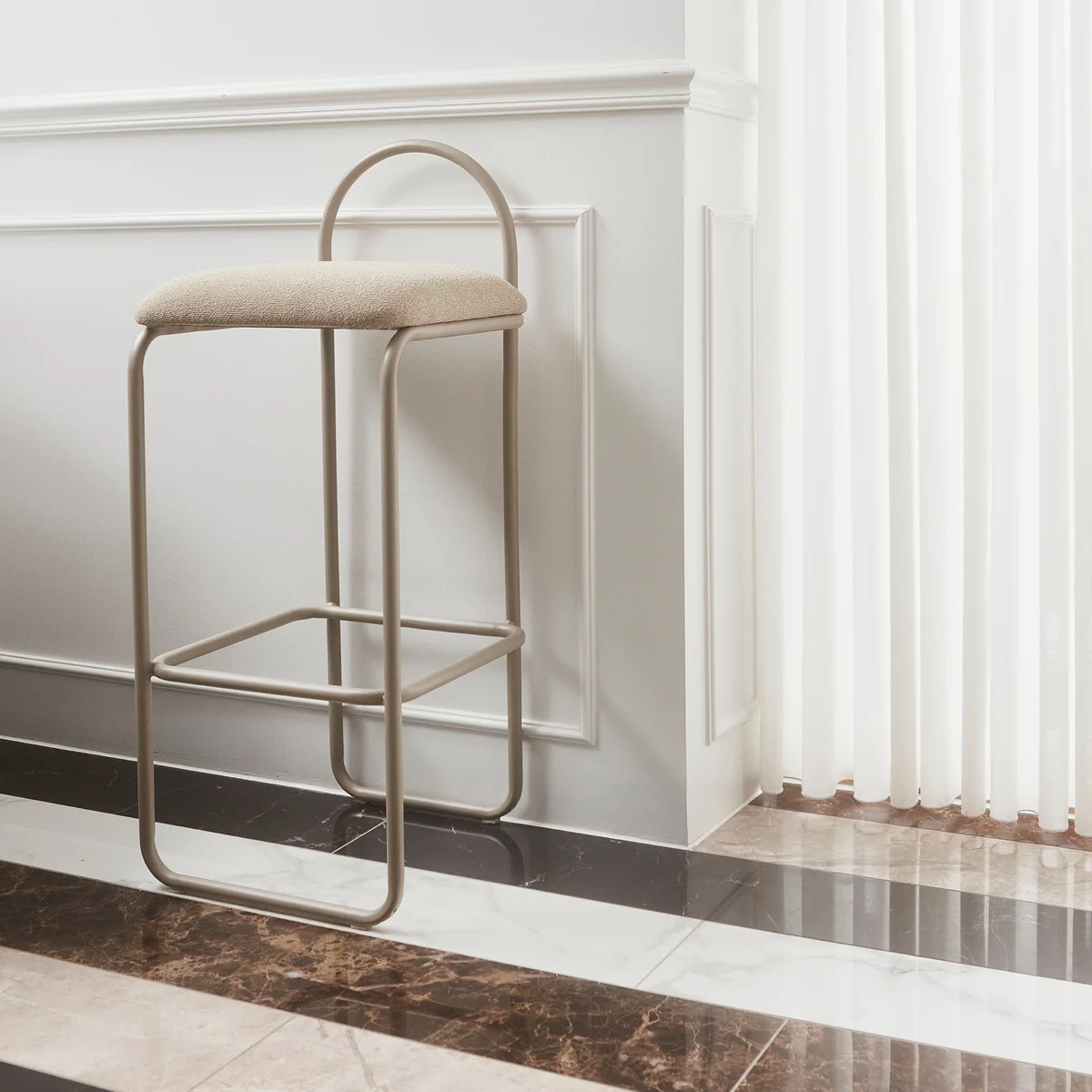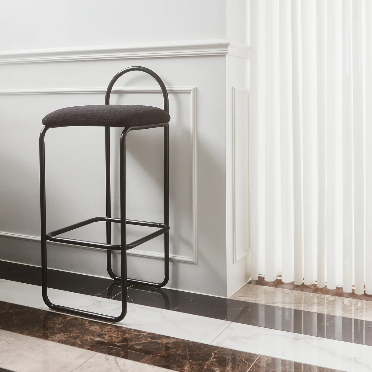 Le confort est assuré par le dossier et le repose-pieds, ce qui permet de passer des heures agréables sur le tabouret de bar Angui de AYTM . Intégré dans un intérieur moderne ou classique, le tabouret de bar attire l'attention et invite à la détente.