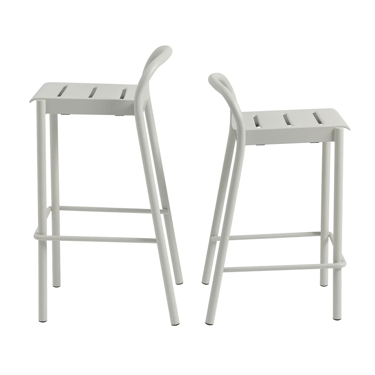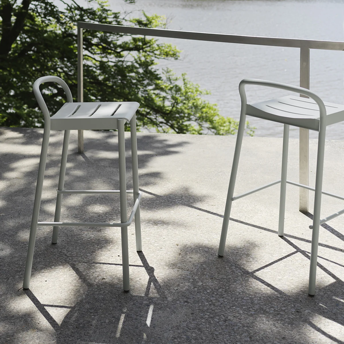 Le tabouret de bar Outdoor Linear Steel de Muuto est maintenu visuellement propre par des lignes épurées afin de garantir une esthétique durable. Son contraste entre le dossier incurvé et les pieds droits assure une expression moderne sur les terrasses privées et publiques, sur le balcon et dans le jardin.