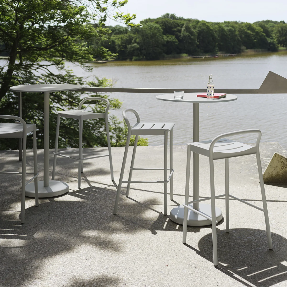 Le tabouret de bar est fabriqué en acier galvanisé et est ensuite revêtu d'une peinture en poudre résistante aux intempéries, d'un mat profond et résistante aux UV. Les pieds sont équipés de patins en plastique, ce qui permet de les utiliser à l'extérieur sans les endommager. Jusqu'à cinq tabourets de bar peuvent être empilés sans problème.