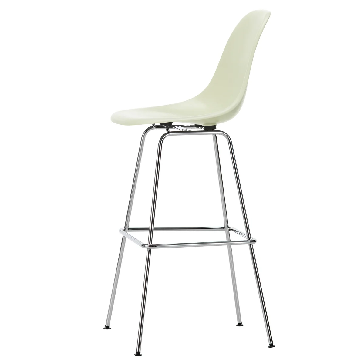 Charles et Ray Eames ont créé, avec les Eames Fiberglass Bar Chairs pour Vitra les premières chaises fabriquées industriellement en plastique. Leurs coques d'assise aux formes organiques sont disponibles avec différents piètements. Le piètement à quatre pieds de la Eames Fiberglass Chaise de bar est disponible en deux hauteurs : moyenne pour les bars de cuisine typiques et haute pour les tables hautes. Il est soit peint en noir par poudrage, soit chromé et dispose d'un repose-pieds.