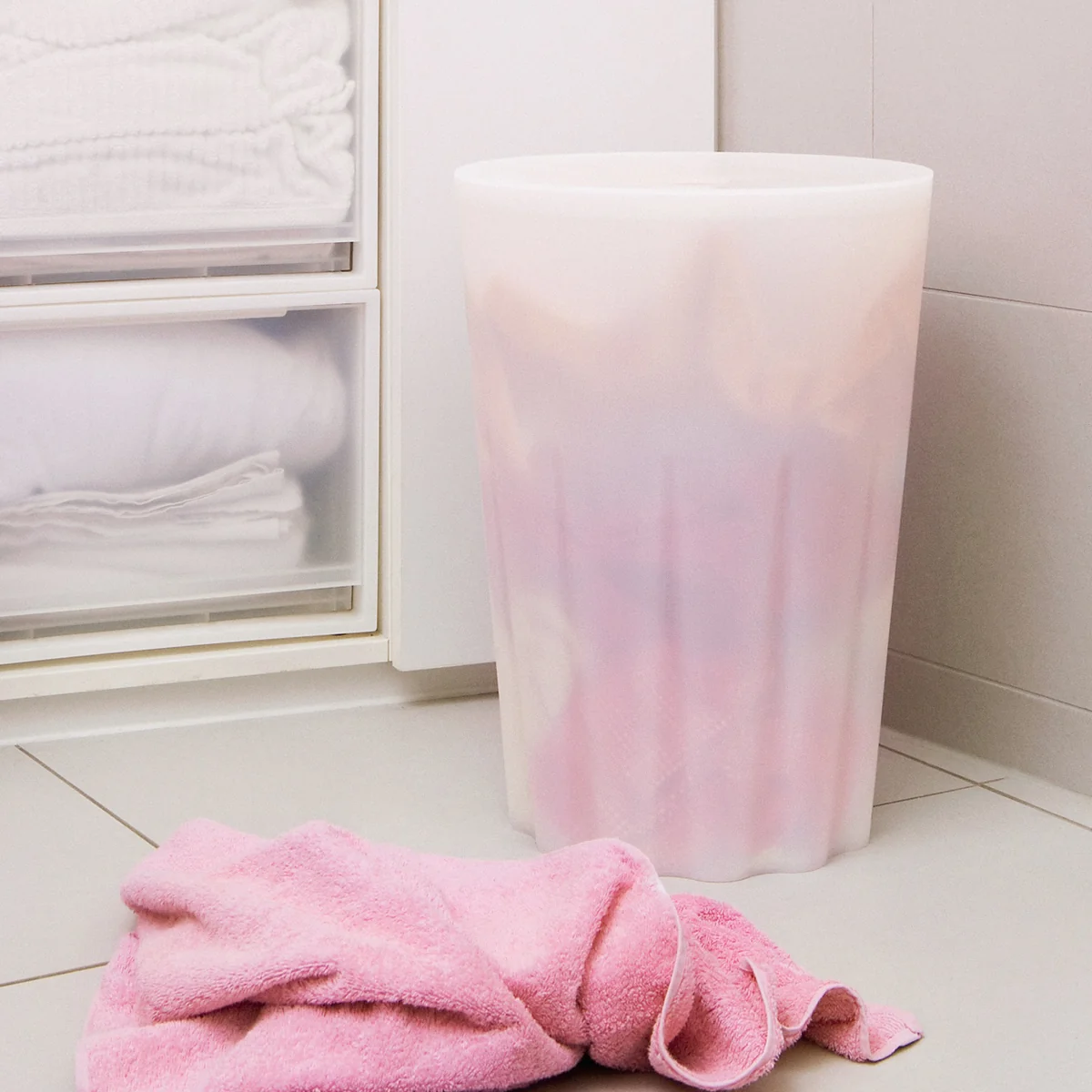 Le tabouret et corbeille à linge de Authentics combine deux fonctions en un seul objet : il sert de grand panier à linge discret avec couvercle et en même temps de siège pratique.