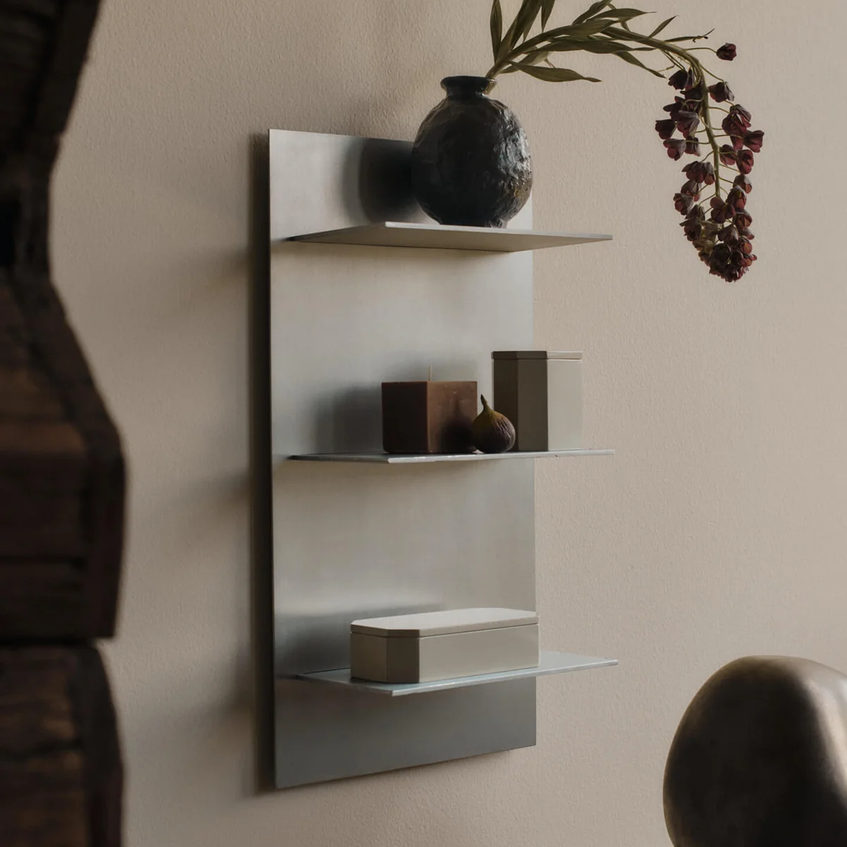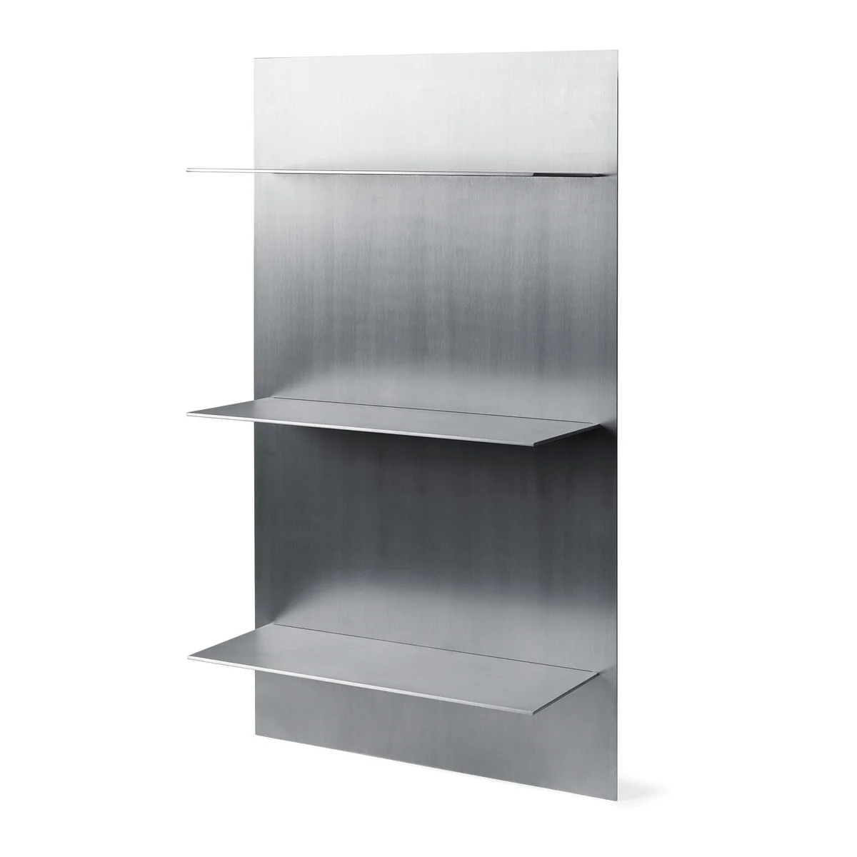 L'étagère murale Lager Triple de Ferm Living est fabriquée en aluminium et reprend l'esthétique industrielle et brutaliste. Elle offre un espace de rangement mince et fonctionnel pour chaque pièce. Le design permet un montage mural facile à l'aide d'un système de suspension français, et l'espacement régulier entre les sections permet d'empiler plusieurs étagères, parfaites pour une exposition de bibliothèque cohérente et haute.