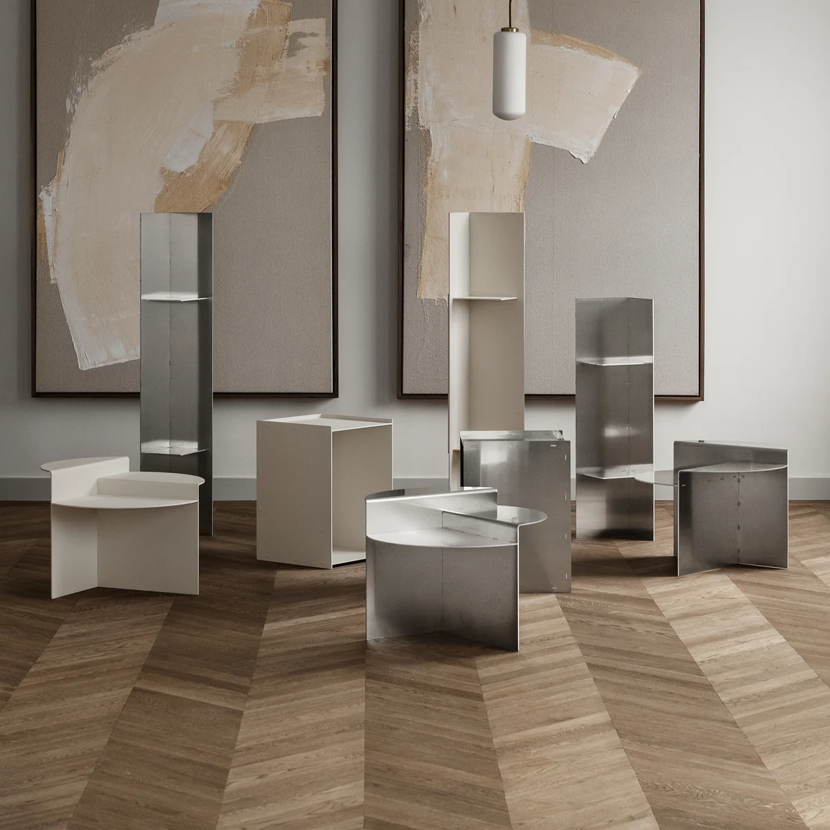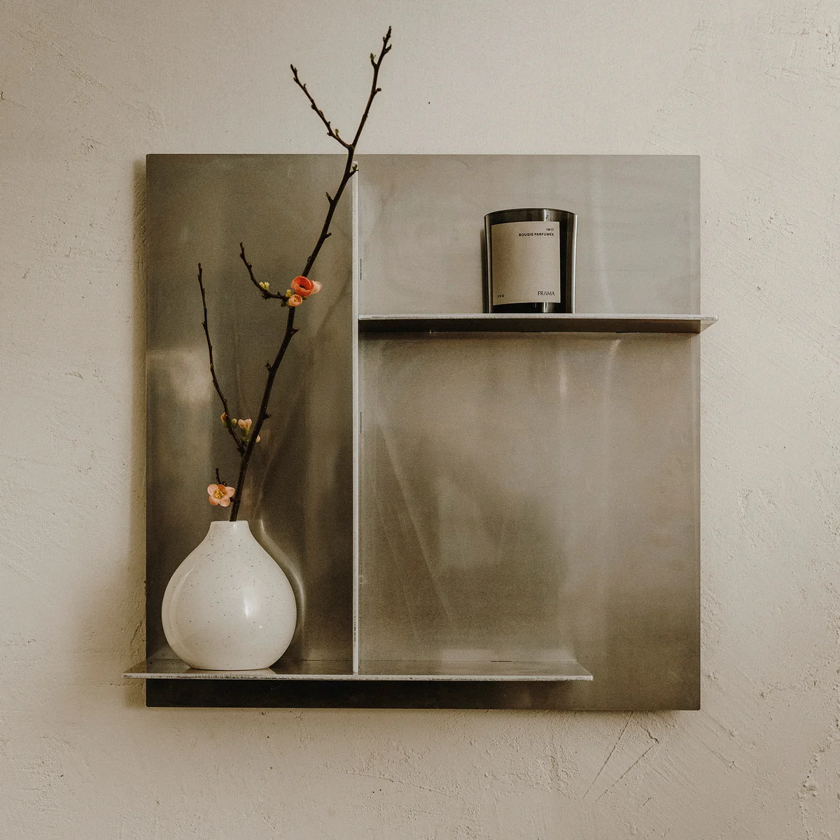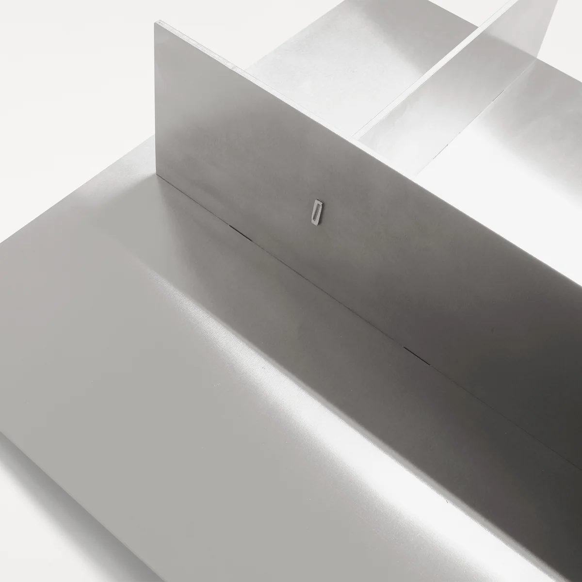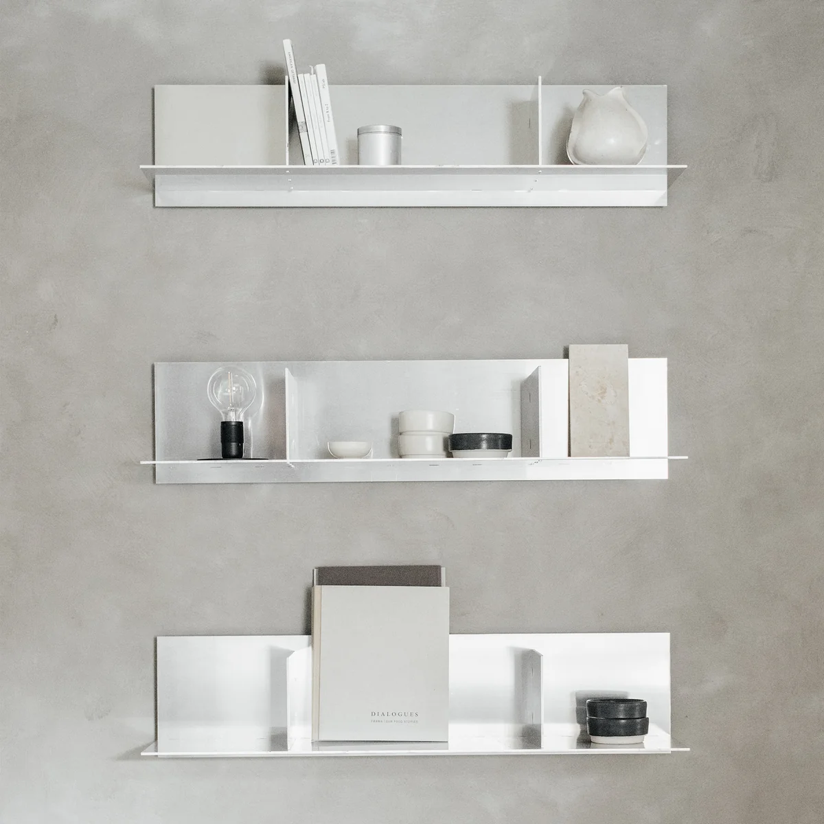 Le site Rivet Typecase L'étagère murale de Frama est fabriquée en aluminium. Le matériau, difficile à travailler pour les meubles, est découpé de manière traditionnelle et martelé à la main. La surface brute, non traitée, est un hommage au caractère industriel du matériau.