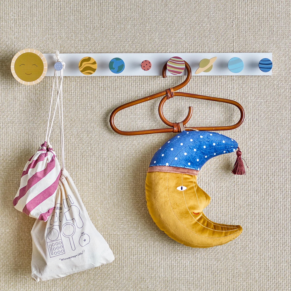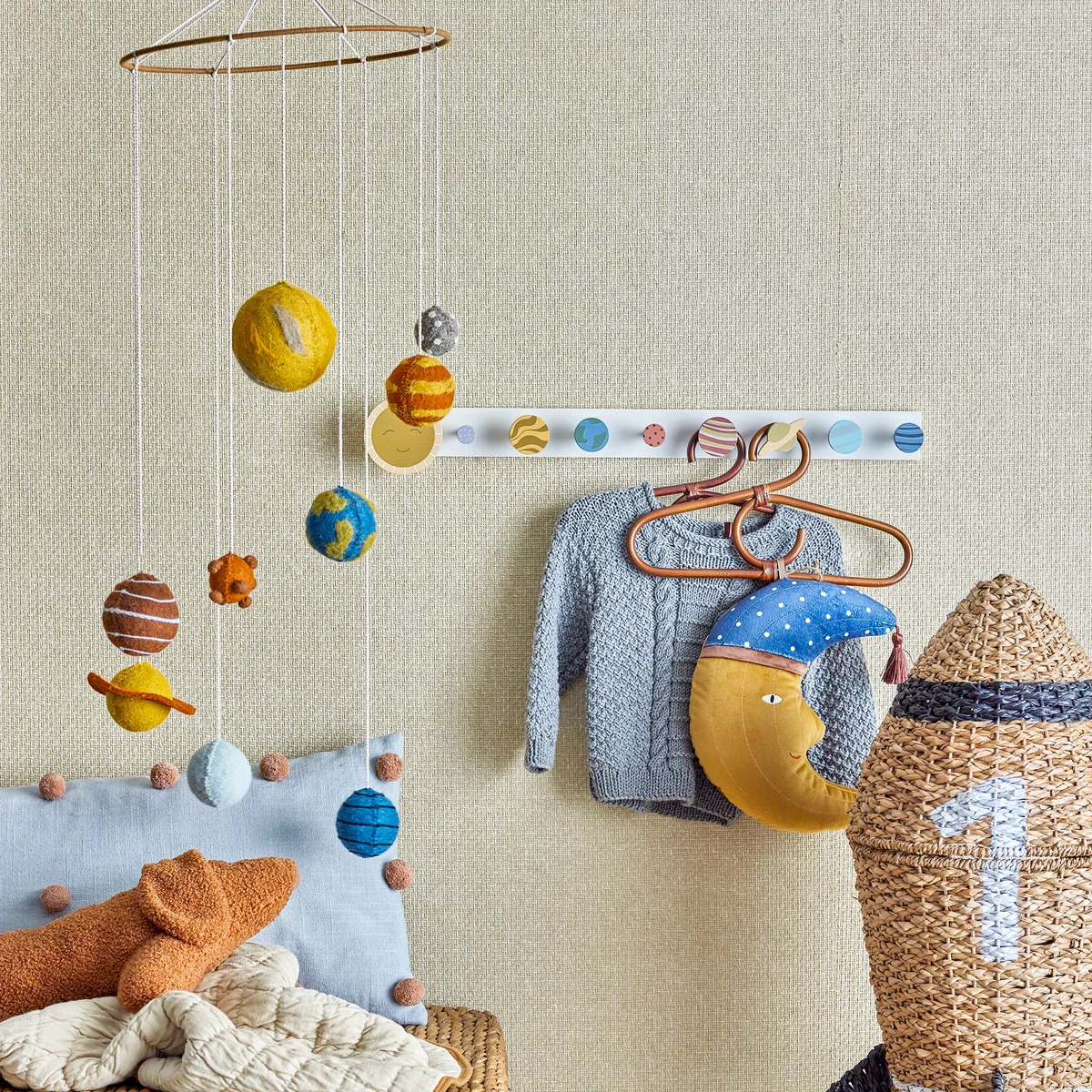 Le Space Porte-crochets de Bloomingville Mini est un cadeau unique pour les enfants curieux et un point fort décoratif pour chaque chambre d'enfant. Ce portemanteau en bois MDF certifié FSC représente notre fascinant système solaire et dispose de crochets avec les noms des planètes au-dessus. Cela permet aux enfants d'en apprendre plus sur les planètes de manière ludique tout en ayant un endroit pratique pour accrocher leurs vestes et leurs sacs. Le site Space La barre à crochets allie merveilleusement l'apprentissage ludique, la fonction et l'esthétique et contribue à stimuler l'imagination et la soif de connaissances des petits explorateurs.