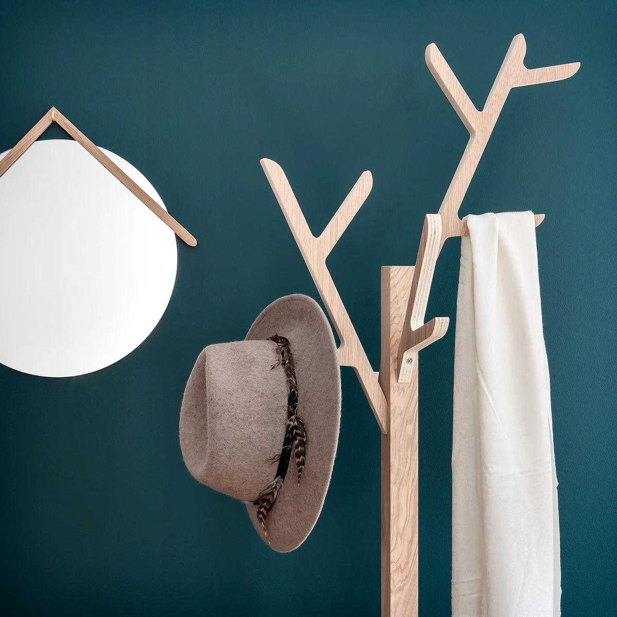 Le portemanteau de Hartô est fabriqué en chêne multiplex et avec un piètement MDF en chêne plaqué. Disponible en différentes versions.