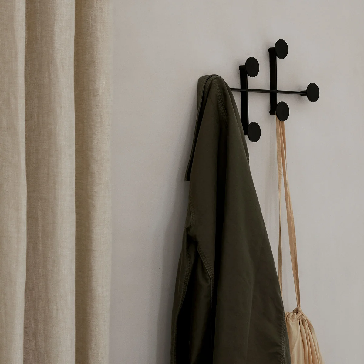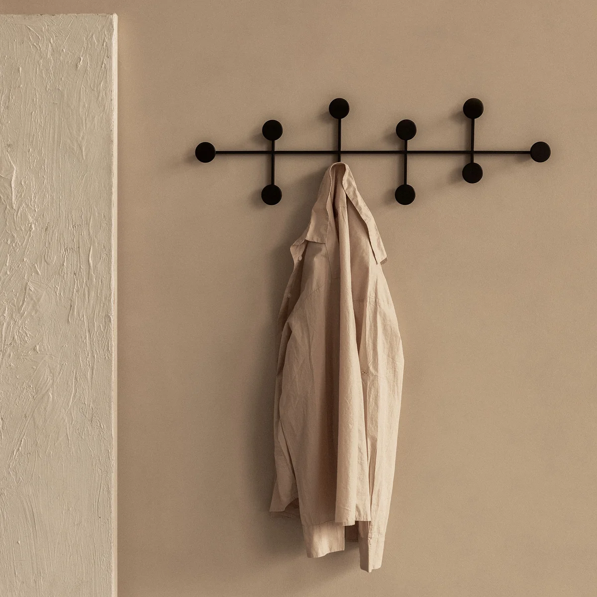 La patère se fixe facilement au mur et toutes les vis sont dissimulées dans le cadre afin que rien ne vienne perturber l'impression de clarté. Elle est fabriquée en métal revêtu par poudre et disponible en différentes couleurs. Il est en outre disponible en différentes tailles.