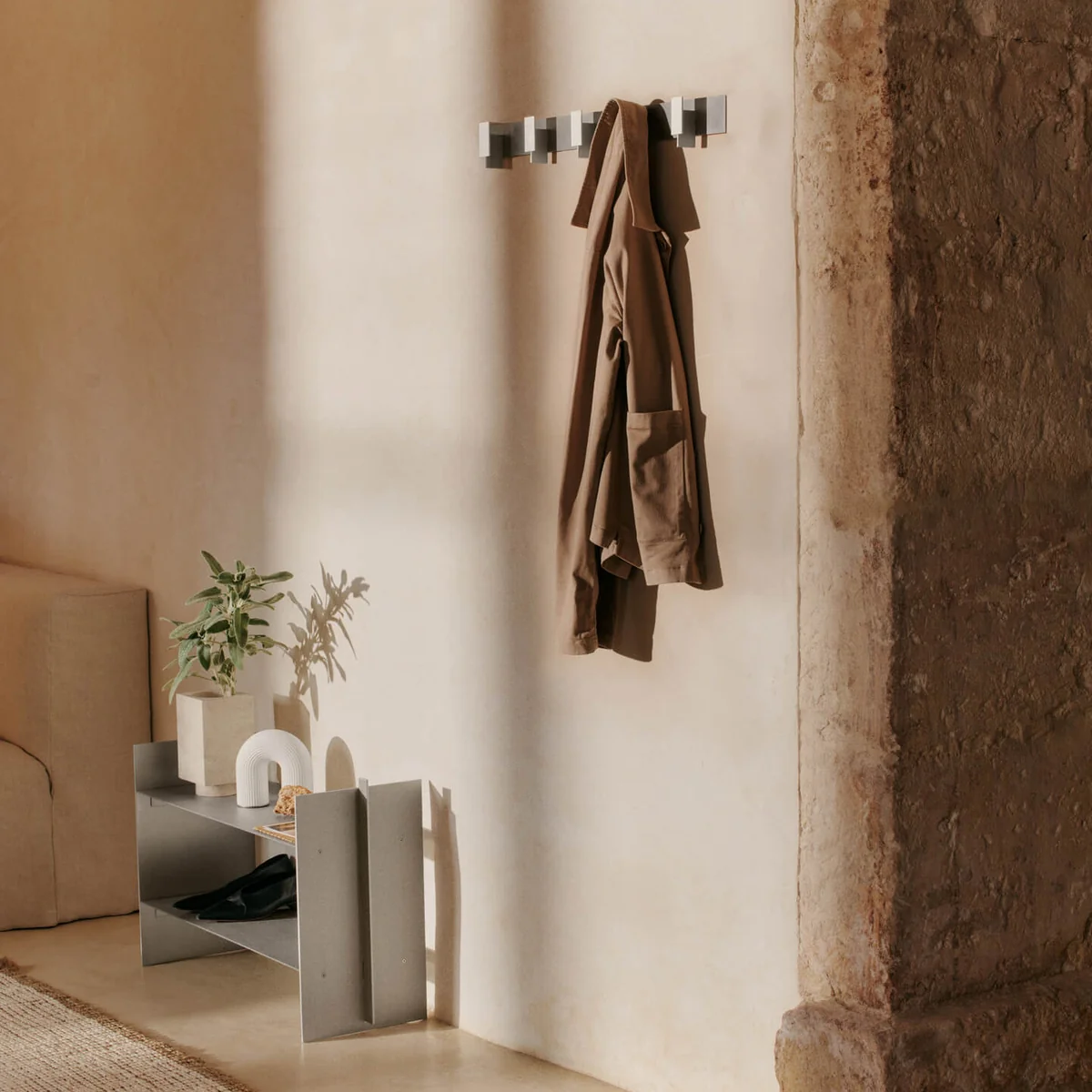 Le portemanteau mural Lager de Ferm Living allie l'esthétique industrielle et l'élégance fonctionnelle. Inspiré du brutalisme, il se distingue par son design sobre en fer revêtu par poudre et est conçu pour un montage mural sans raccords. Elle offre une solution élégante et pratique pour suspendre vestes, manteaux et accessoires, tandis que sa forme minimaliste confère à chaque couloir une note moderne et marquante.