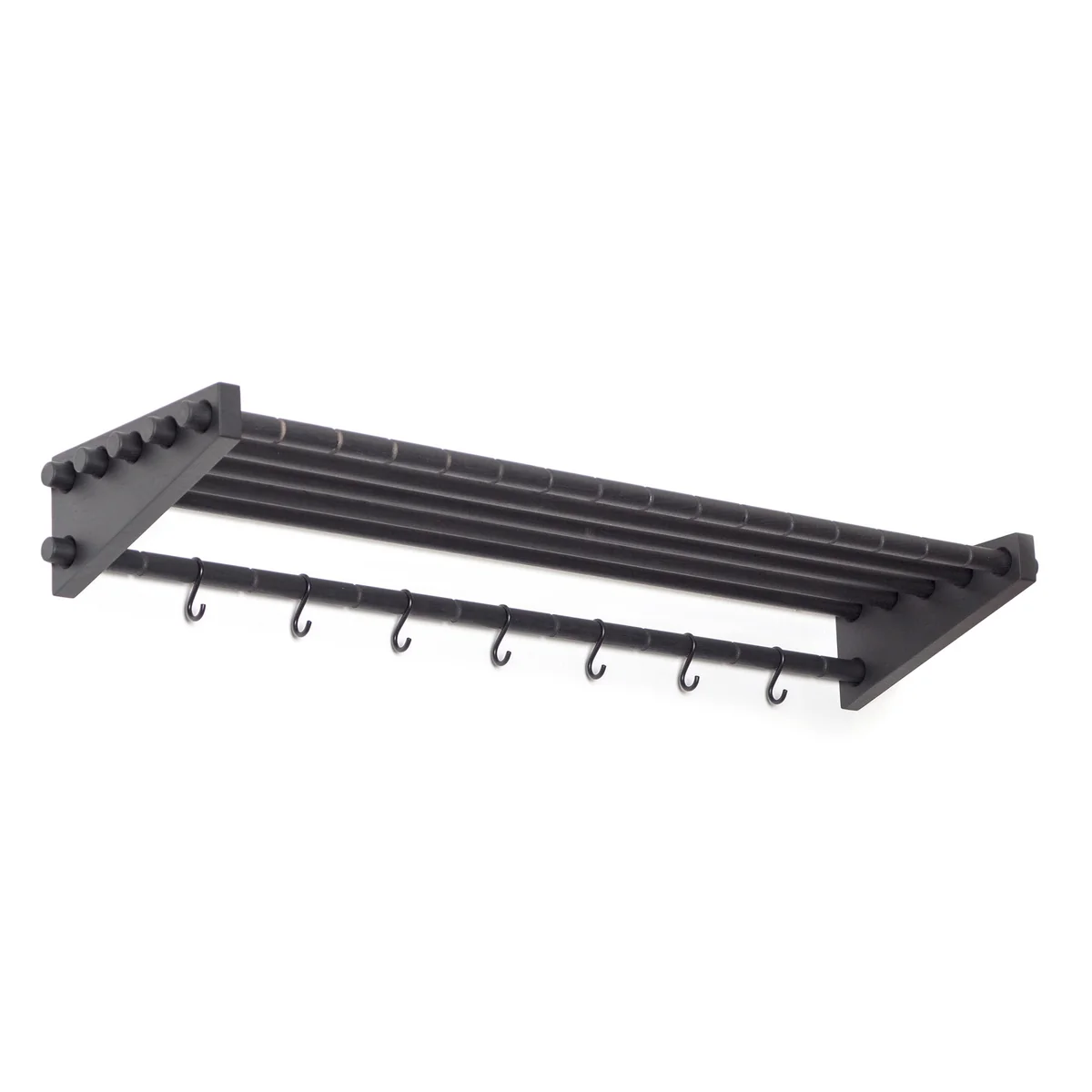 Les barres de la surface de rangement sont fabriquées en chêne massif fumé et naturel et peuvent même être utilisées pour suspendre des cintres. Ainsi, tous les essentiels sont prêts à être utilisés lorsqu'il faut aller vite. Avec son aspect rustique, ce portemanteau attire le regard et peut être combiné de multiples façons.