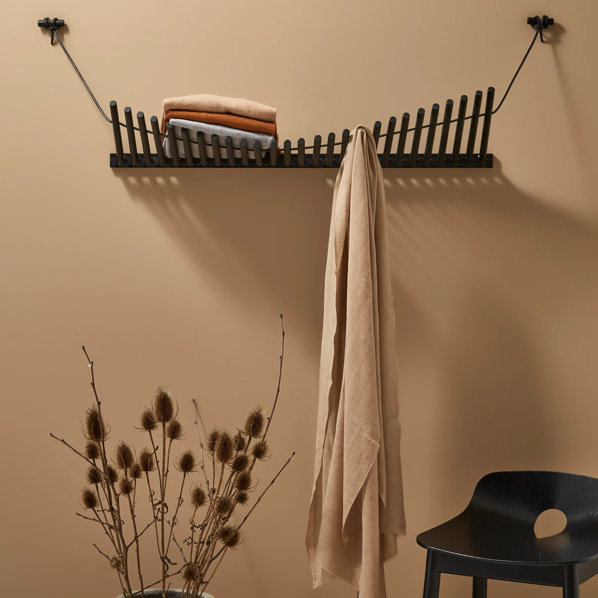 L'armoire murale Knaegt de Woud convainc par son esthétique élégante. La simple répétition de bâtons de bois avec un cordon de cuir continu rend la garde-robe dynamique, car la ligne créée par les bâtons change en fonction de ce qui est suspendu sur l'étagère. Cela donne à la garde-robe un caractère moderne et vivant.