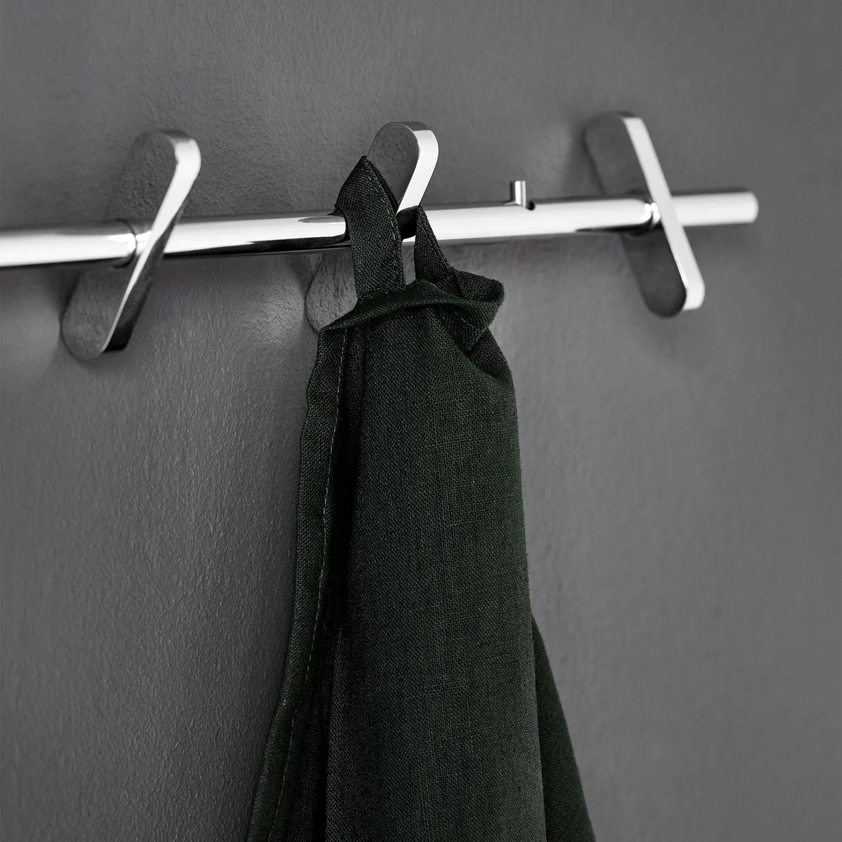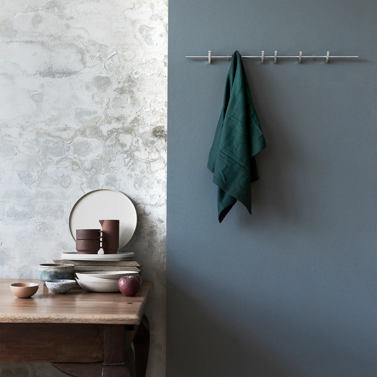 Une étroite bande d'acier revêtue de poudre ou chromée sert de base, qui est complétée par des goupilles coulissantes. Les broches glissent facilement sur la barre et peuvent être déplacées selon les besoins. Des broches supplémentaires peuvent également être ajoutées si une capacité plus importante est nécessaire. Le site web de l Coat Rack Barre de crochet en deux tailles (70 cm avec 6 broches ou 40 cm avec 4 broches) ainsi qu'en différentes couleurs.