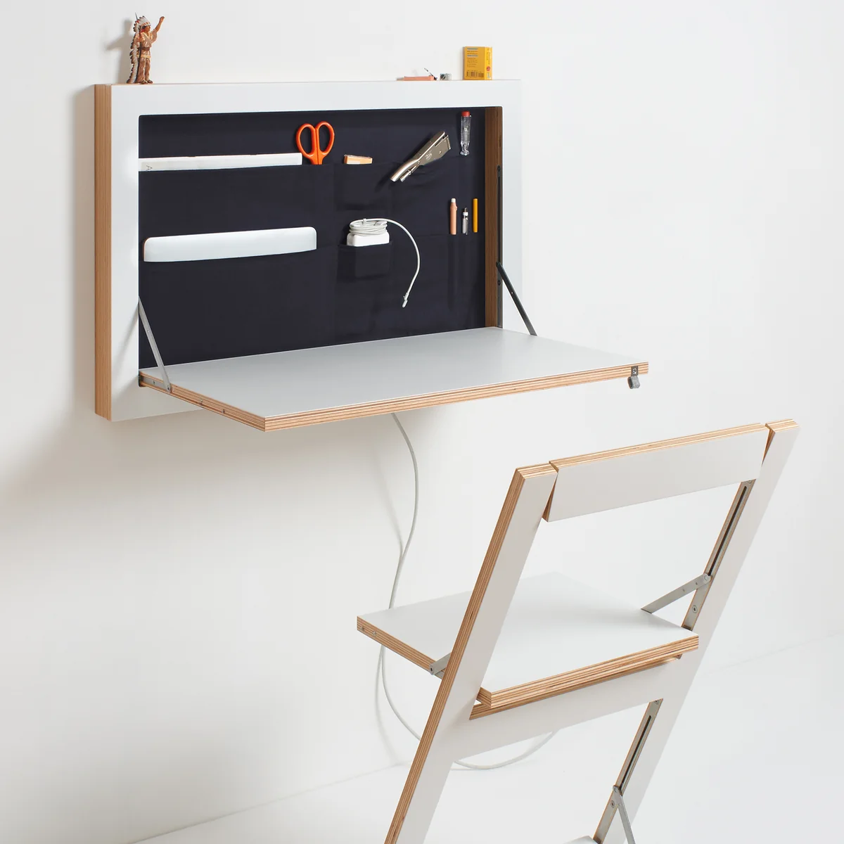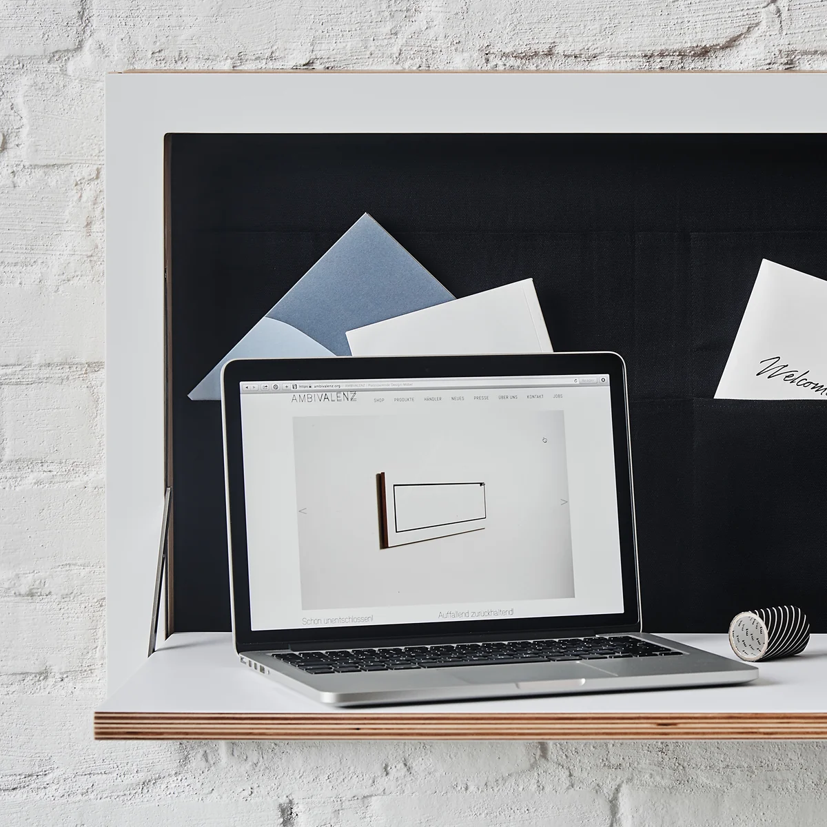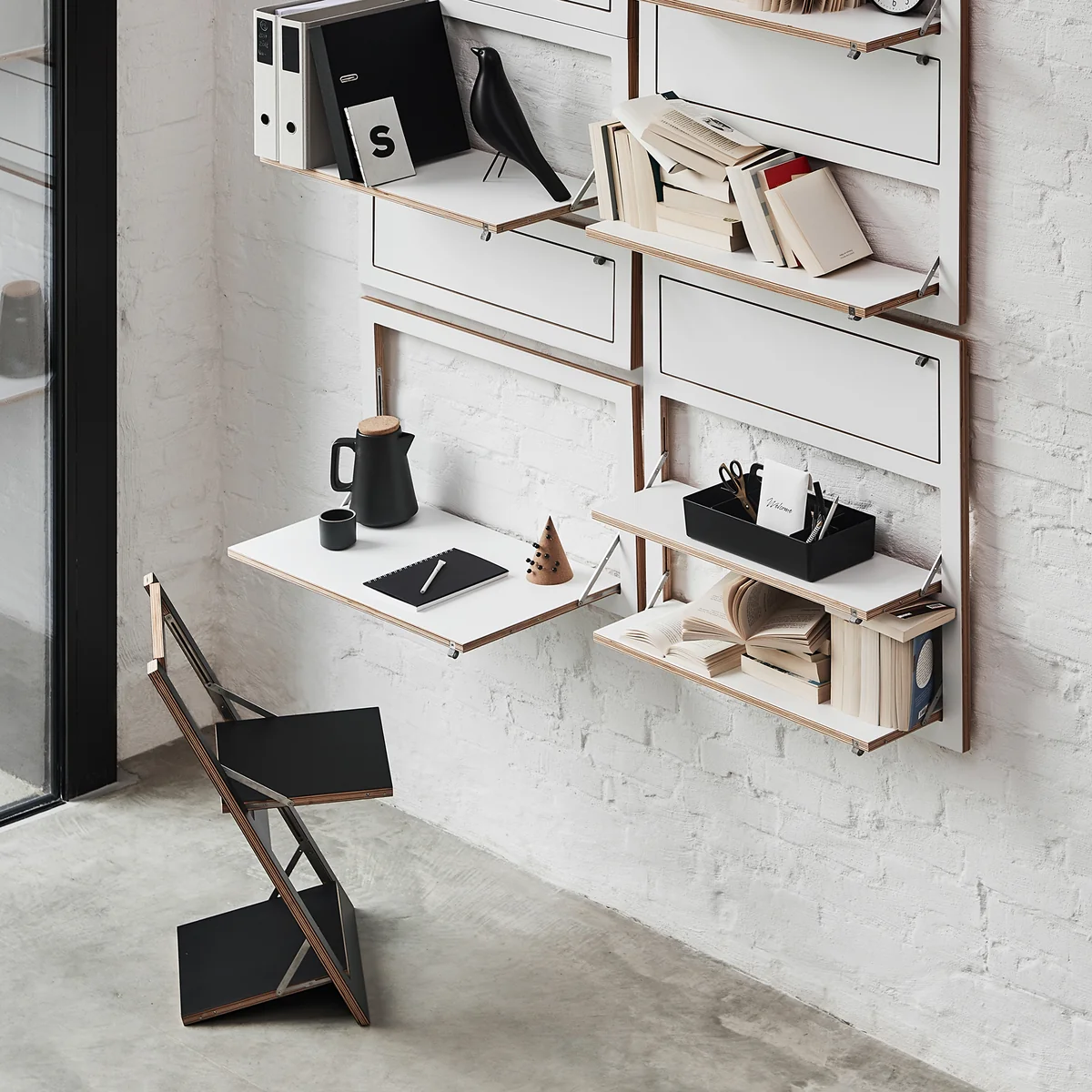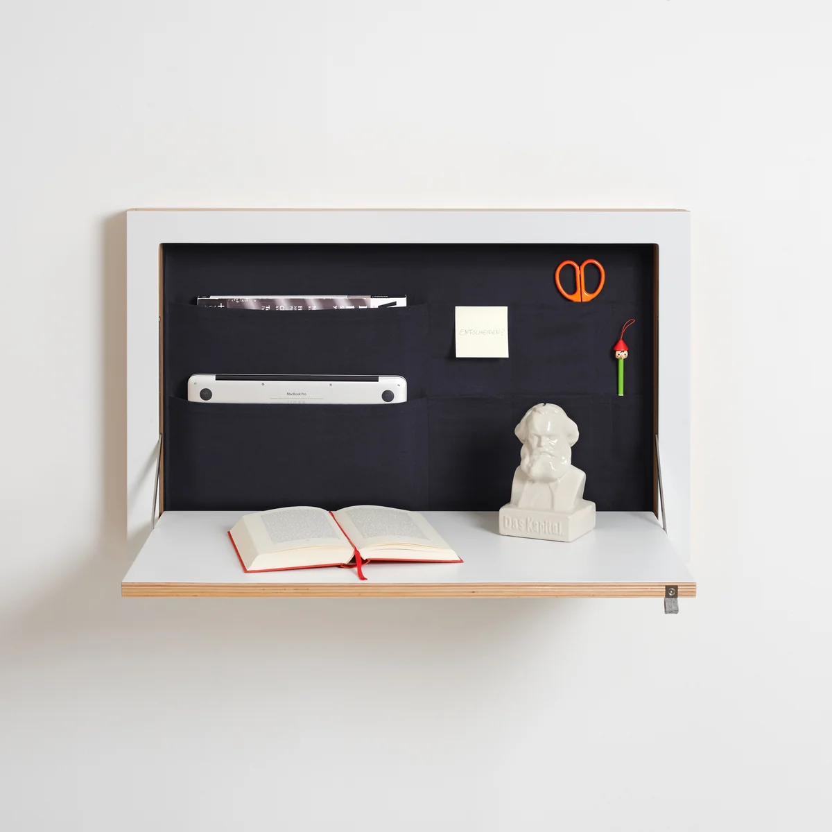 Le Fläpps secrétaire d'État de Ambivalenz est un secrétaire mural pliable. Une fois replié, le secrétaire séduit par sa profondeur totale extrêmement fine, mais ce n'est qu'une fois déplié qu'il déploie tout son potentiel.