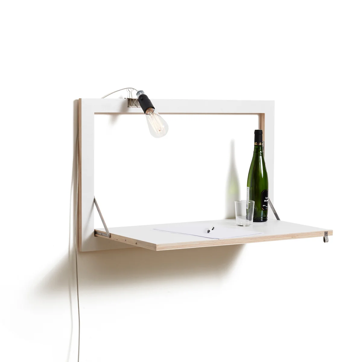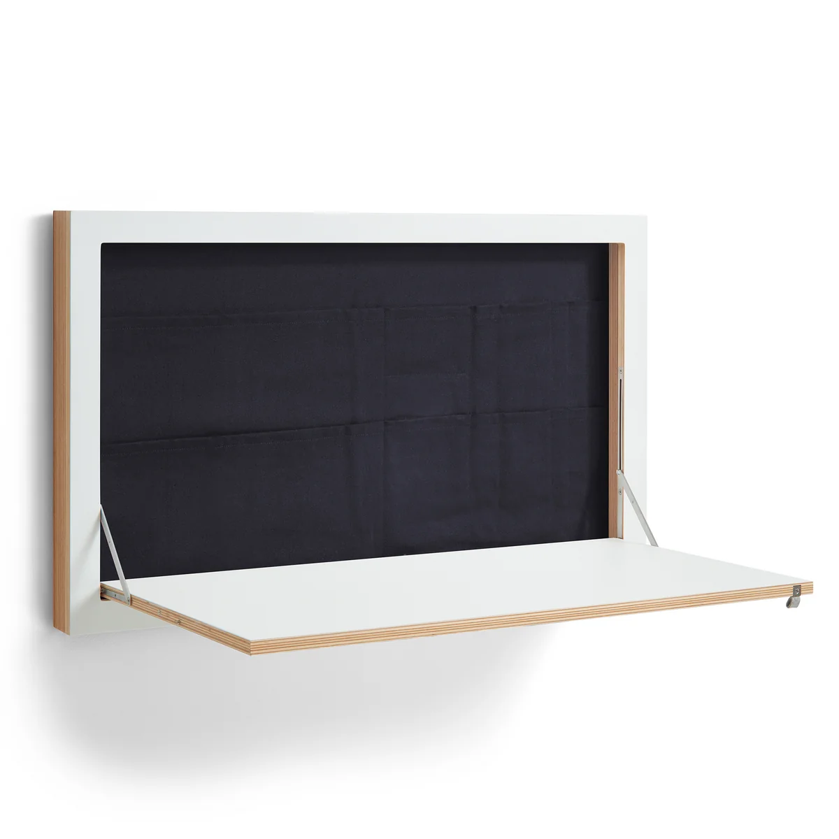 On peut travailler, manger, jouer et bricoler sur le plateau déplié. Le secrétaire est idéal comme bureau dans le bureau ou la chambre d'enfant, comme table à manger dans la cuisine ou comme table de maquillage dans la chambre à coucher. La table peut être suspendue à n'importe quelle hauteur et se transforme ainsi en table haute pliable.