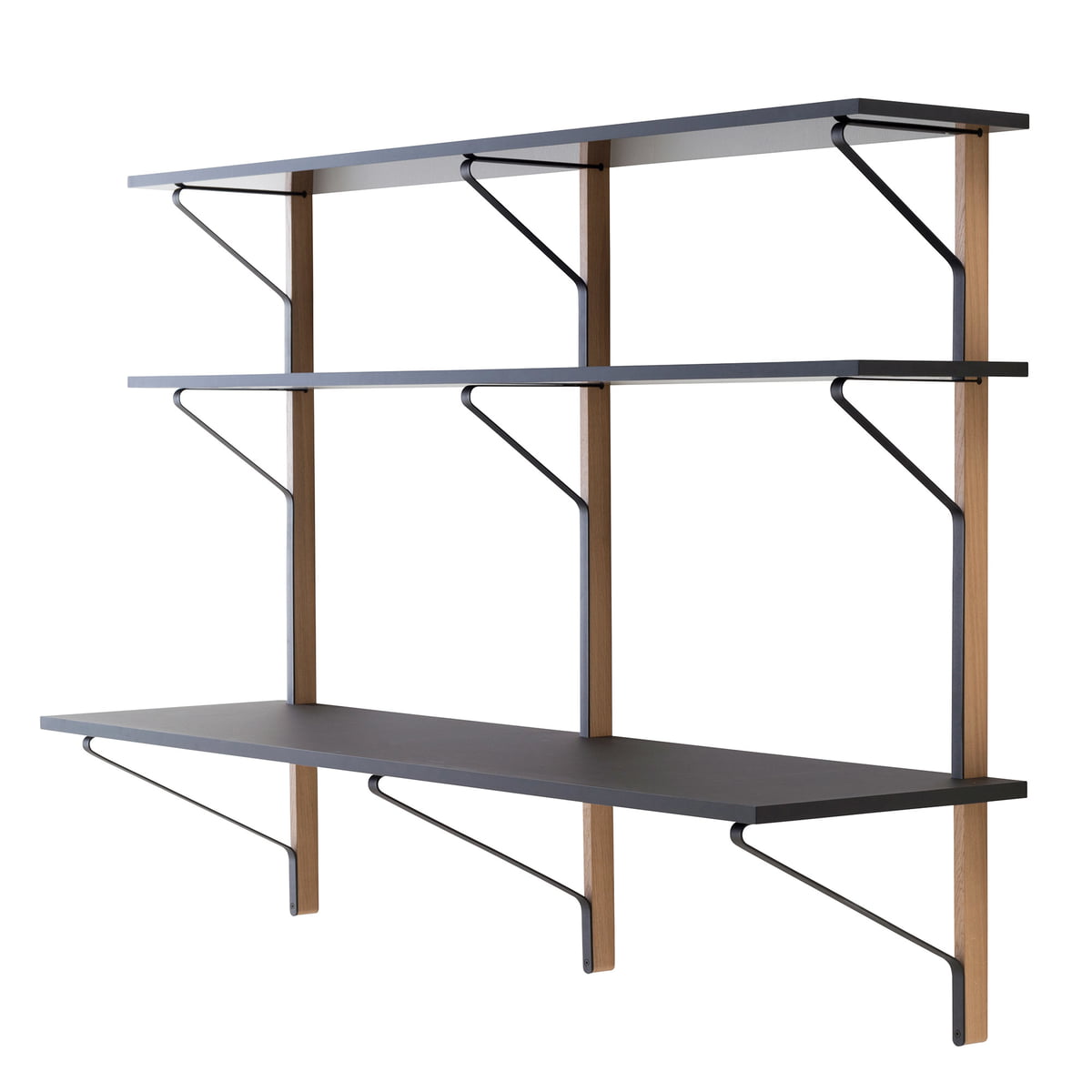L’étagère murale Kaari avec un bureau intégré par Artek fait partie de la collection innovante de Ronan et Erwan Bouroullec dont l’idée repose sur un pied de table qui se transforme en équerre avec une nouvelle fonction pour le plateau. L’étagère pratique offre assez d’espace sur trois niveaux afin de travailler et ranger les dossiers, les livres ou la décoration. L’étagère étroite est très bien adaptée aux petites pièces parce qu’elle remplit deux fonctions : d’une part, elle range deux meubles de manière peu encombrante et d’autre part, elle les combine de façon élégante.