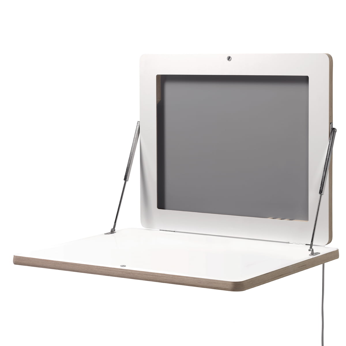 Le Flatframe est un lieu de repos pour les terminaux mobiles : il est doté d’une prise multiple presque invisible qui est intégrée dans le cadre en lamellé-collé multiplexe recouvert pour les chargeurs avec la fiche européenne. Cet objet qui gagne de la place peut aussi servir de pense-bête mural magnétique grâce au dos revêtu par poudre coloré. Le plan de travail à plier du cadre frontal (disponible en option) est recouvert de linoléum de grande qualité et transforme le Flatframe en un poste de travail debout fonctionnel qui est bénéfique au dos. Ainsi, cette face avant individualisée par de propres photos cache un petit bureau rangé derrière un motif préféré.