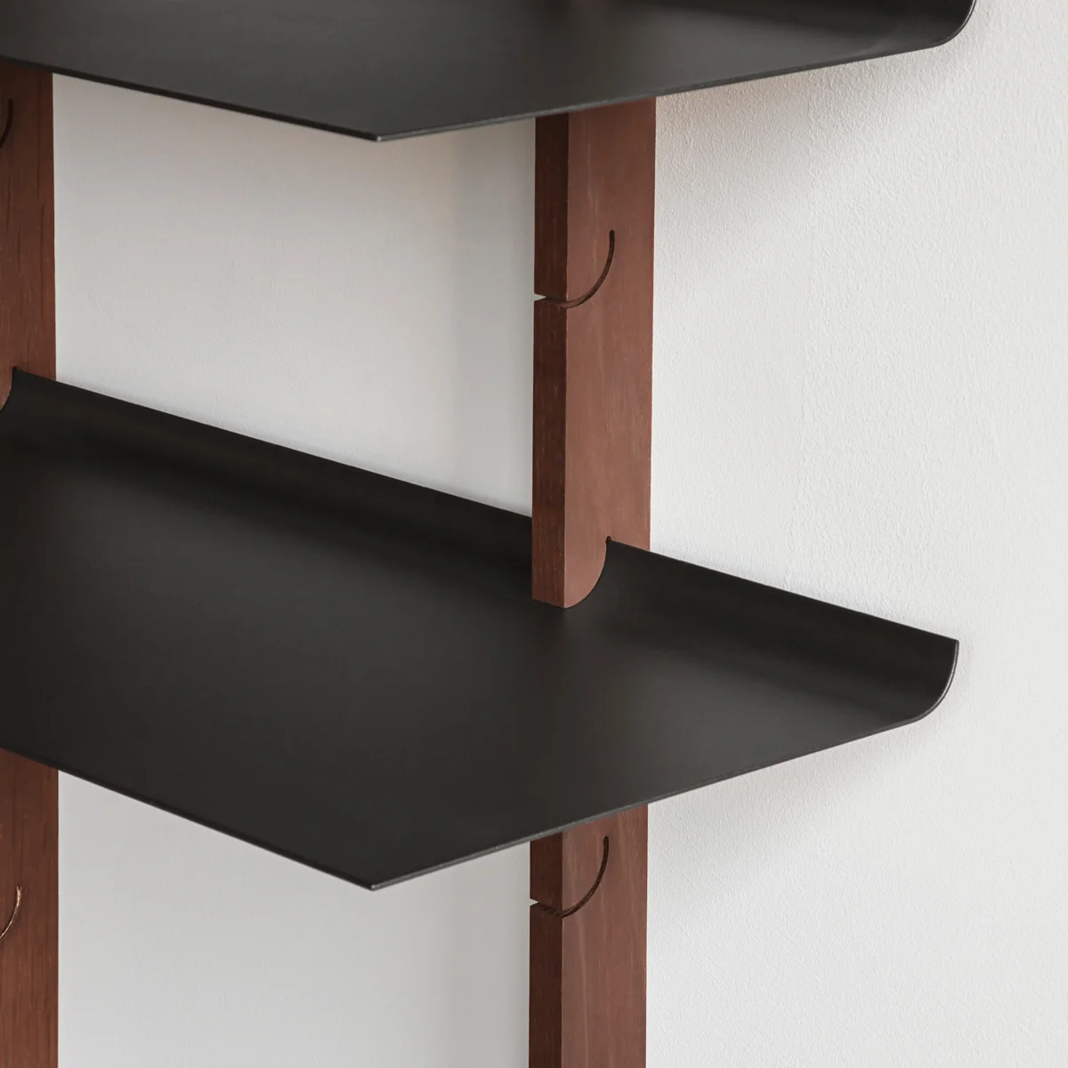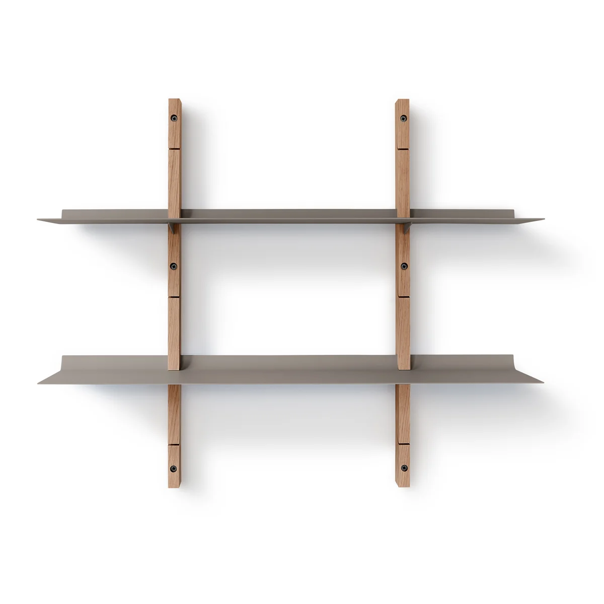 Le système de rayonnage est constitué de joues en bois de chêne, qui sont pourvues de fentes. Les étagères en acier peint par poudrage y sont simplement accrochées sans qu'il soit nécessaire d'utiliser des supports supplémentaires. Si vous le souhaitez, les étagères peuvent également être déplacées encore et encore pour créer une nouvelle apparence. Les étagères sont également repliées vers le mur, afin que les livres et autres objets ne rayent pas le mur. La conception de la Smile Le système de rayonnages provient de la conception des outils.