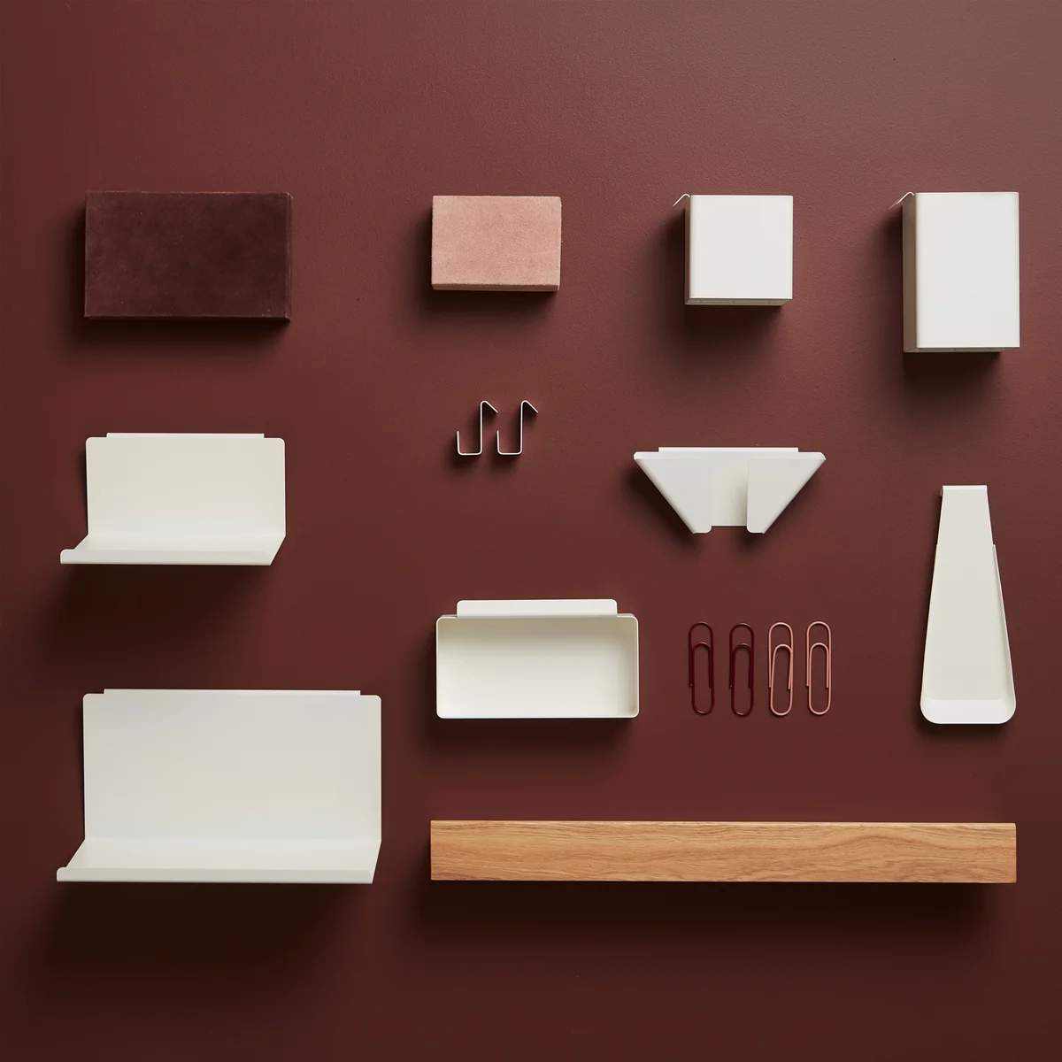 Flex est un système de classement polyvalent de Gejst qui peut être facilement conçu selon vos propres idées. La base du système est la barre d'étagères Flex, sur laquelle les étagères, crochets, miroirs et conteneurs assortis peuvent être placés facilement. Grâce à un aimant puissant, les accessoires peuvent toujours être rangés sur la barre ou enlevés. De cette façon, il est toujours possible de créer une nouvelle configuration qui correspond à l'espace et aux besoins.