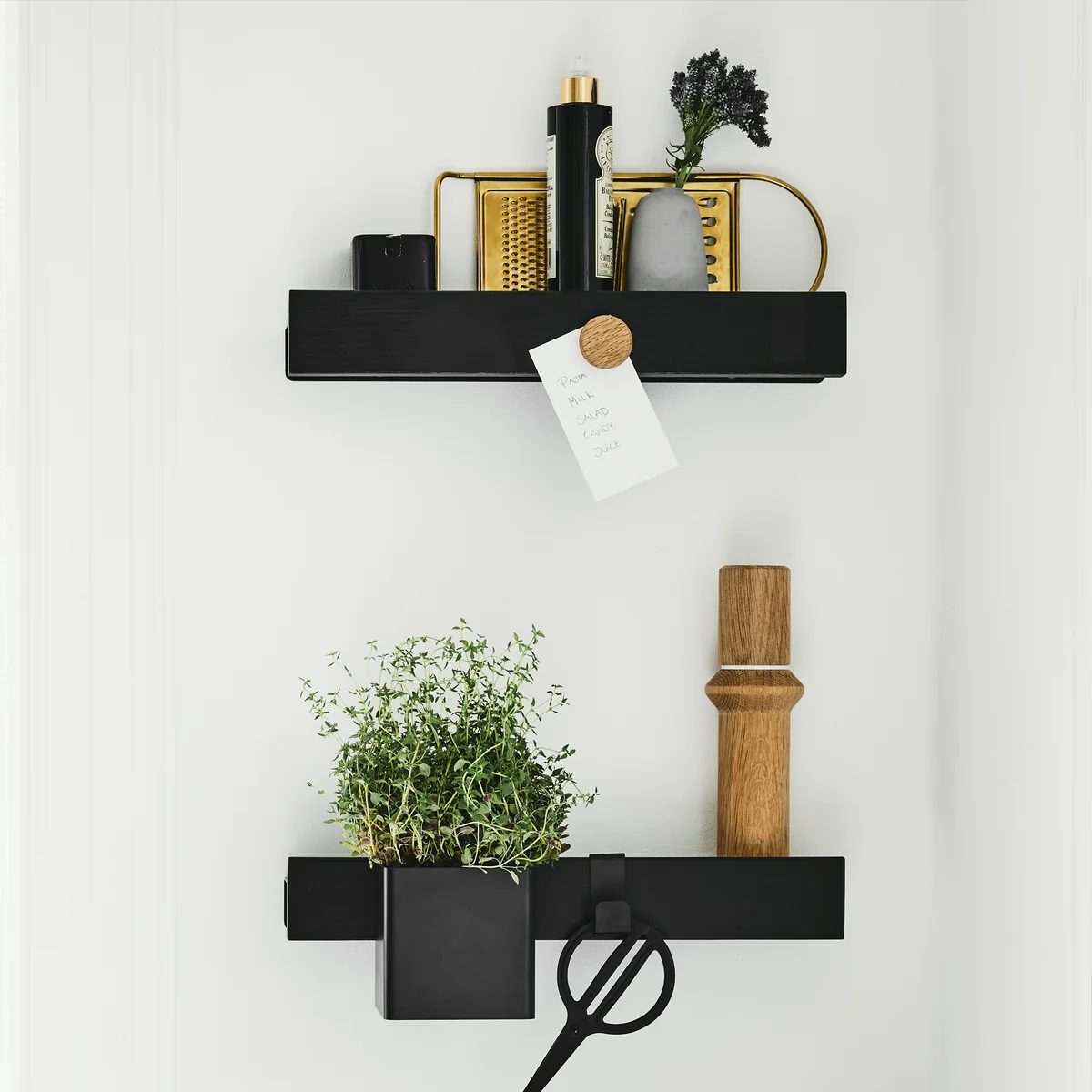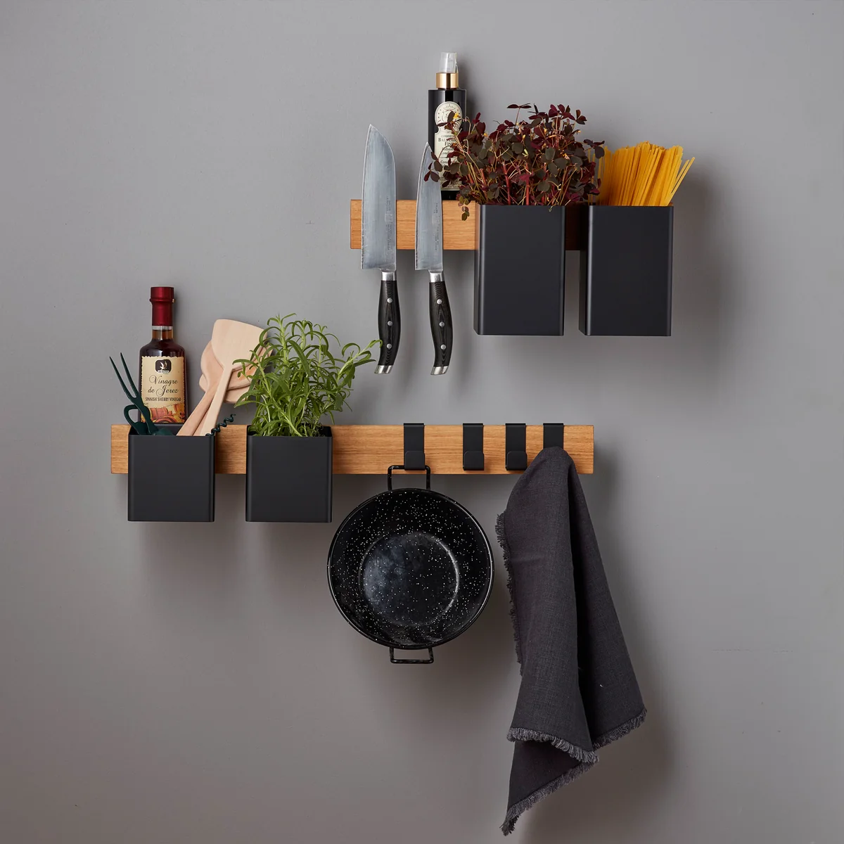 Flex peut être utilisé comme étagère pour les cosmétiques dans la salle de bains, comme bande magnétique pour les notes au bureau ou comme étagère décorative dans le salon. Flex ne remplit pas seulement son rôle d'appareil de rangement, mais convainc également par son design simple et moderne. L'étagère a une façade en chêne, tandis que le support mural est en acier et donc magnétique.