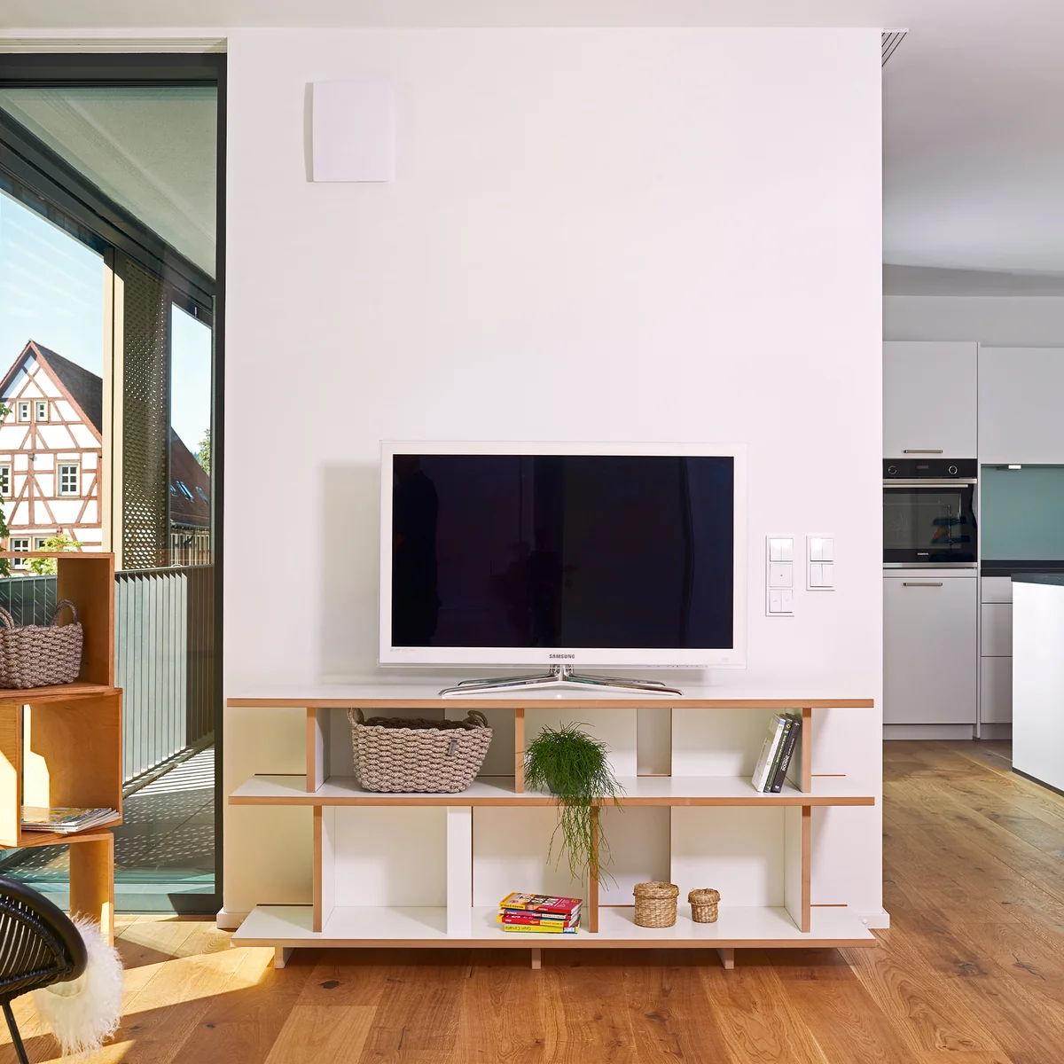 Le site stell Le système d'étagères de Tojo peut être conçu de manière flexible et individuelle, qu'il s'agisse d'un petit buffet autoportant ou d'une haute étagère murale. Le système d'étagères autoportantes blanches peut être étendu à tout moment. Les modules individuels de différentes longueurs et hauteurs peuvent être facilement combinés entre eux.