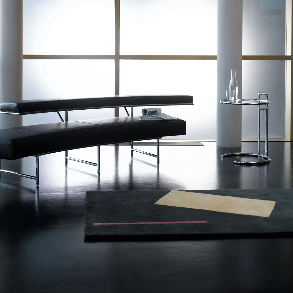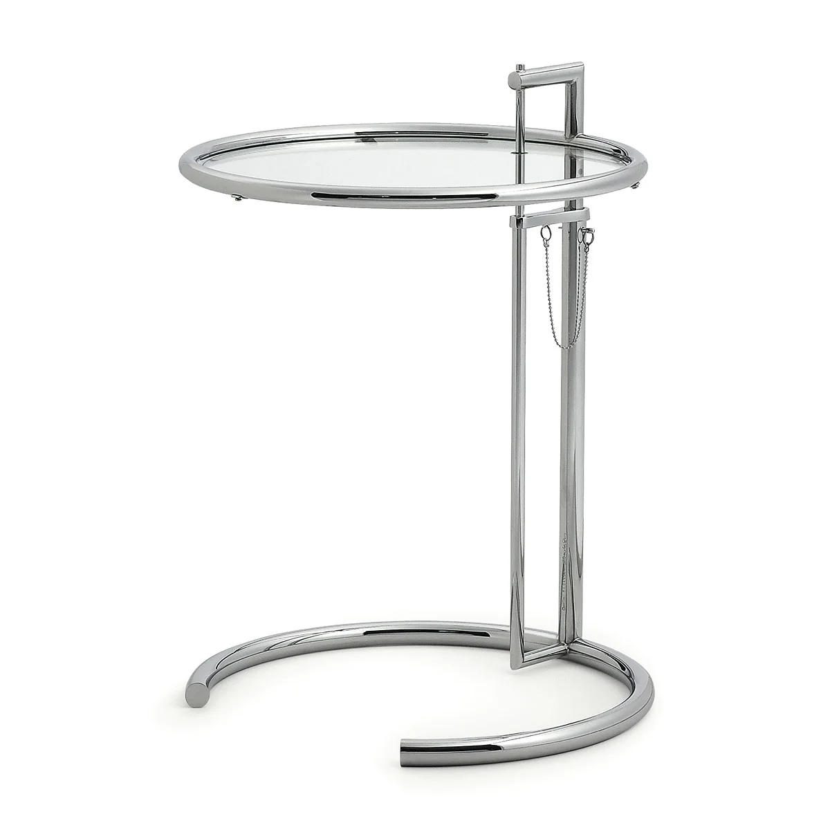 Le cadre réglable en hauteur de la table d'appoint est fabriqué en tube d'acier chromé. La version classique comporte un plateau en verre de cristal clair. En outre, la table ajustable est également disponible avec un plateau en verre Parsol gris ou un plateau en métal laqué noir.
