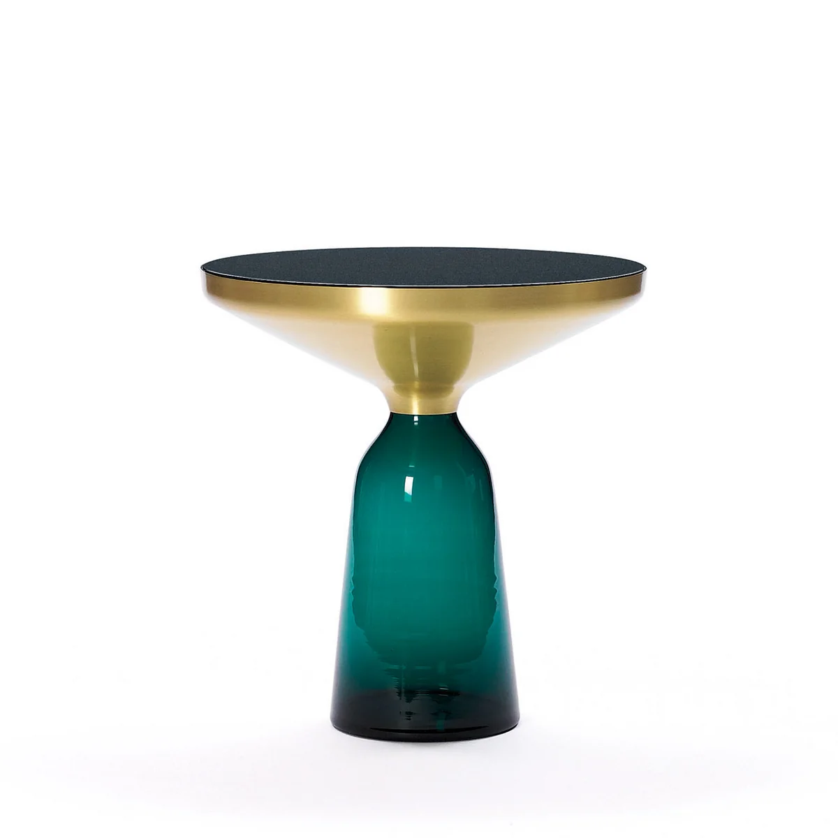 La table d'appoint Bell de Sebastian Herkner renverse l'utilisation habituelle des matériaux et surprend la perception : ici, le pied de la table se transforme en une forme de verre prégnante, colorée et transparente dans l'espace, sur laquelle repose un corps métallique.