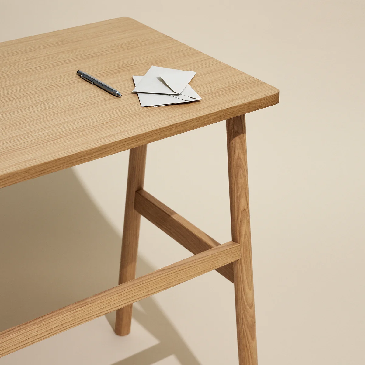 Le bureau Acorn de la maison danoise Hübsch Interior est, avec ses lignes et structures au design clair, un superbe complément dans l'habitat. Le bureau est fabriqué en placage de chêne certifié FSC et séduit par ses pieds avant légèrement évasés et ses pieds arrière droits. Les fines entretoises en bois rectilignes lui confèrent un look minimaliste.