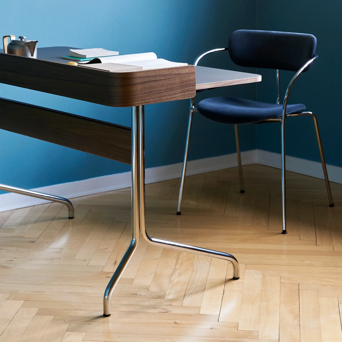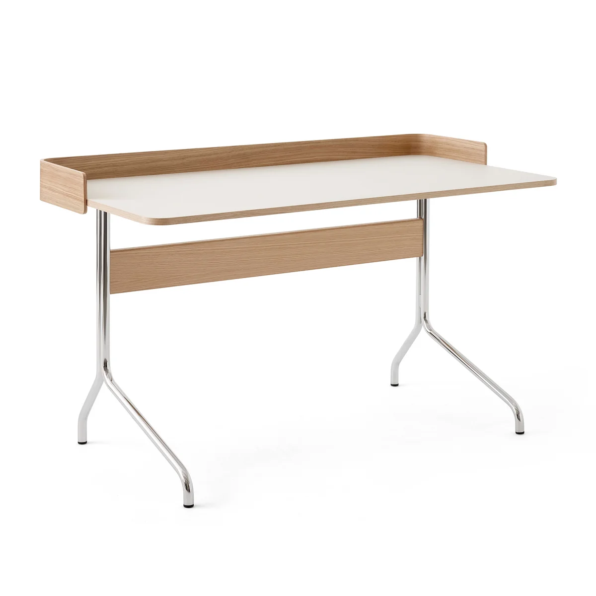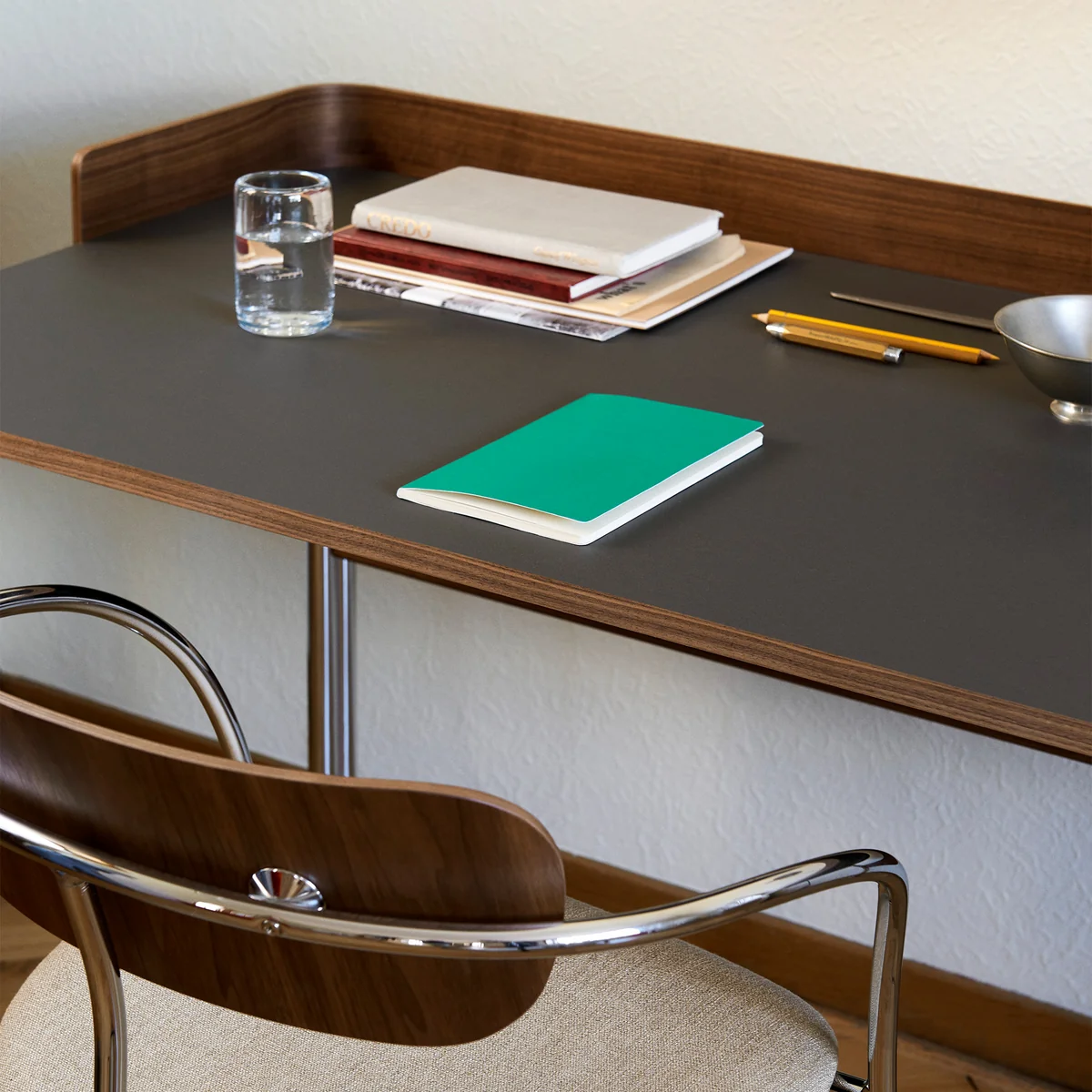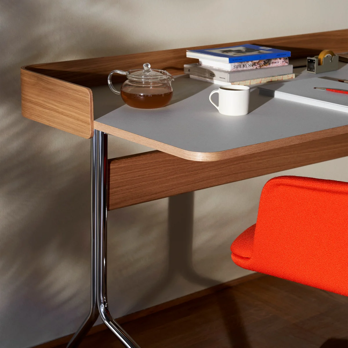 Le bureau Pavilion AV17 de & tradition a été conçu par le duo de designers finlandais Anderssen & Voll. Après le design des chaises Pavilion, le design fin et fonctionnel est maintenant également disponible sous forme de bureau, qui convient non seulement au bureau, mais aussi au bureau à domicile. Les concepteurs ont accordé une attention particulière à la fonctionnalité du bureau à domicile. La bordure en placage n'offre pas seulement un contraste visuel, elle empêche également les objets de tomber et permet de poser des instruments d'écriture.