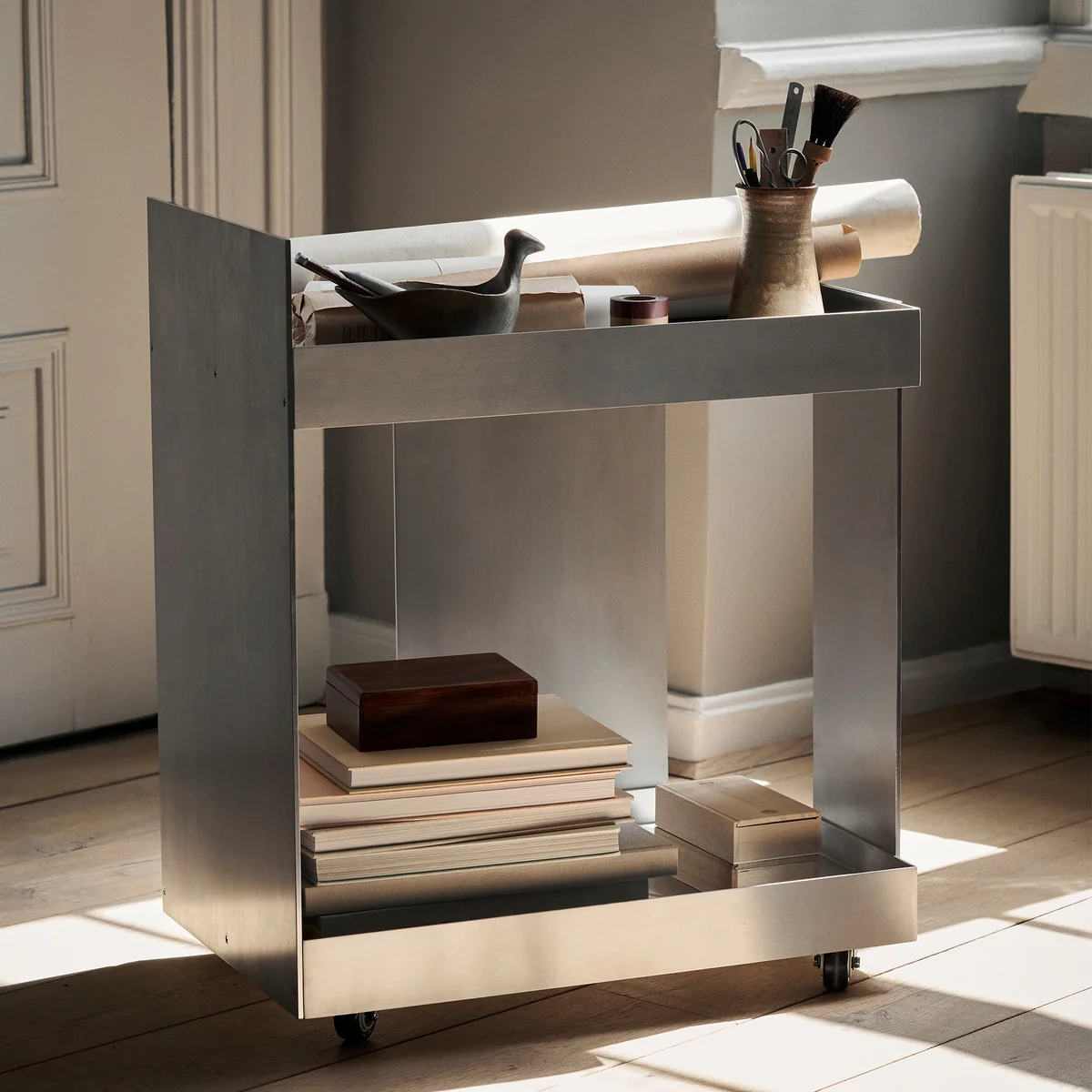 Le trolley Lager de la maison Ferm Living tire son nom du mot danois signifiant "entrepôt", ce qui caractérise également sa fonction. Le trolley sculptural sert de merveilleux complément à la maison. Il peut être utilisé de manière idéale comme chariot de bar stylé, comme table d'appoint polyvalente ou de manière classique comme possibilité de rangement dans le bureau.
