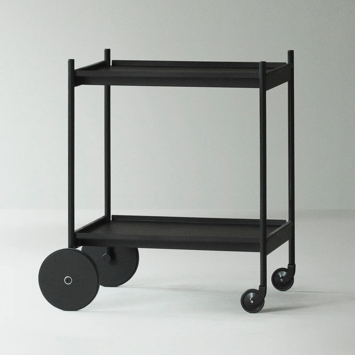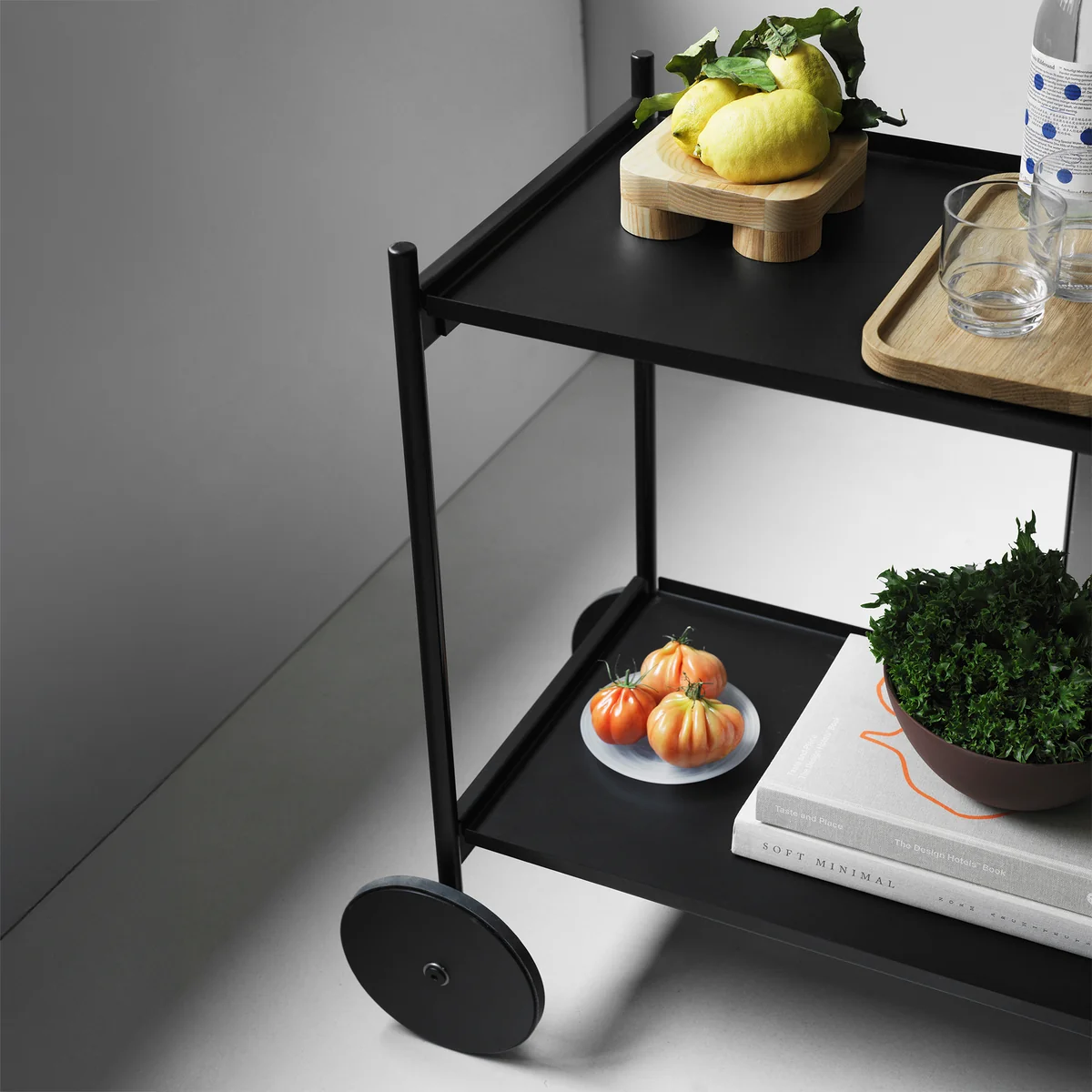 Le Rul Trolley séduit par son design fin et minimaliste et est fabriqué en acier durable à revêtement par poudre. Sa construction filigrane lui confère une silhouette élégante, tandis que quatre roues assurent une maniabilité optimale - deux petites permettent un mouvement à 360°, tandis que deux plus grandes assurent une stabilité supplémentaire. Grâce à deux plateaux amovibles, le chariot s'adapte sans peine aux différents besoins quotidiens et offre une solution pratique pour le service et le rangement.