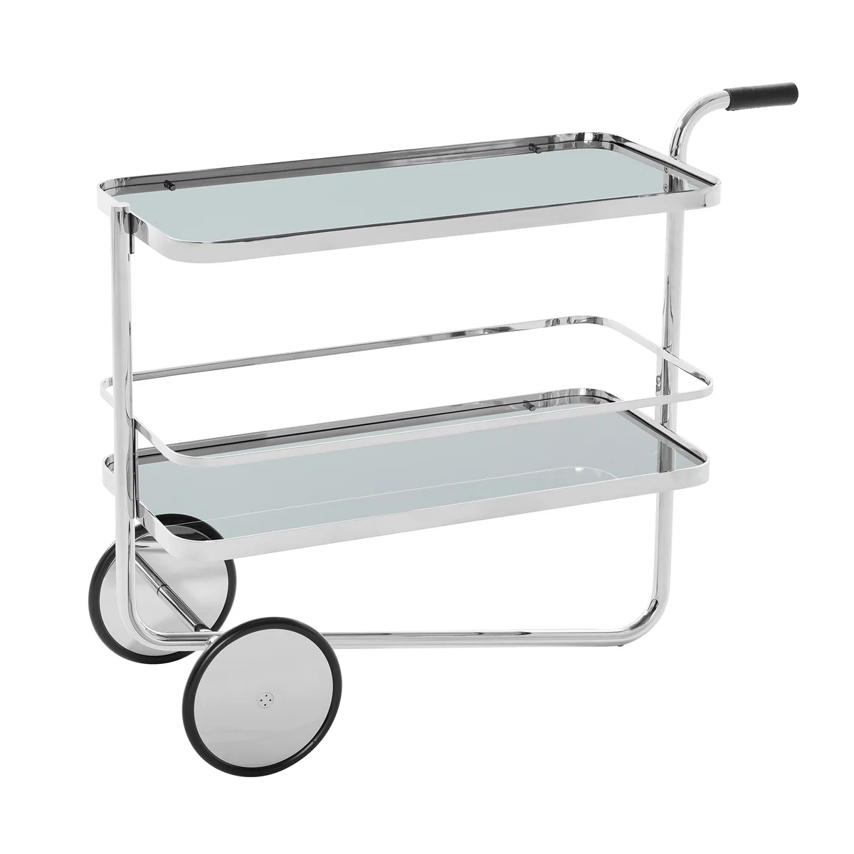 Le chariot de service S 179 de Thonet , conçu par Ludwig Mies van der Rohe, incarne le principe du modernisme dans sa forme la plus pure : Le design suit systématiquement la fonction. La construction filigrane en tube d'acier chromé est soutenue par un tube central courbé sur toute sa longueur, qui constitue également la structure portante. Le chariot repose sur trois points - deux roues et le genou avant du châssis - et peut être soulevé et déplacé facilement grâce à la poignée en cuir noir de cœur portant le logo Thonet .