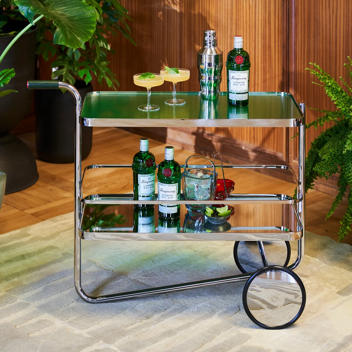 Deux étagères en verre clair teinté offrent un espace généreux pour les verres, les bouteilles et les accessoires de bar, mais conviennent également pour les livres ou les objets décoratifs. Les surfaces en verre sont maintenues par un cadre en acier plat chromé, tandis qu'une rambarde complétée par Thonet assure une sécurité supplémentaire au niveau inférieur. Dans le cadre de la réédition, le chariot de service a été légèrement agrandi afin de répondre aux exigences actuelles en matière d'habitat et d'utilisation - sans pour autant perdre le caractère emblématique de l'original.