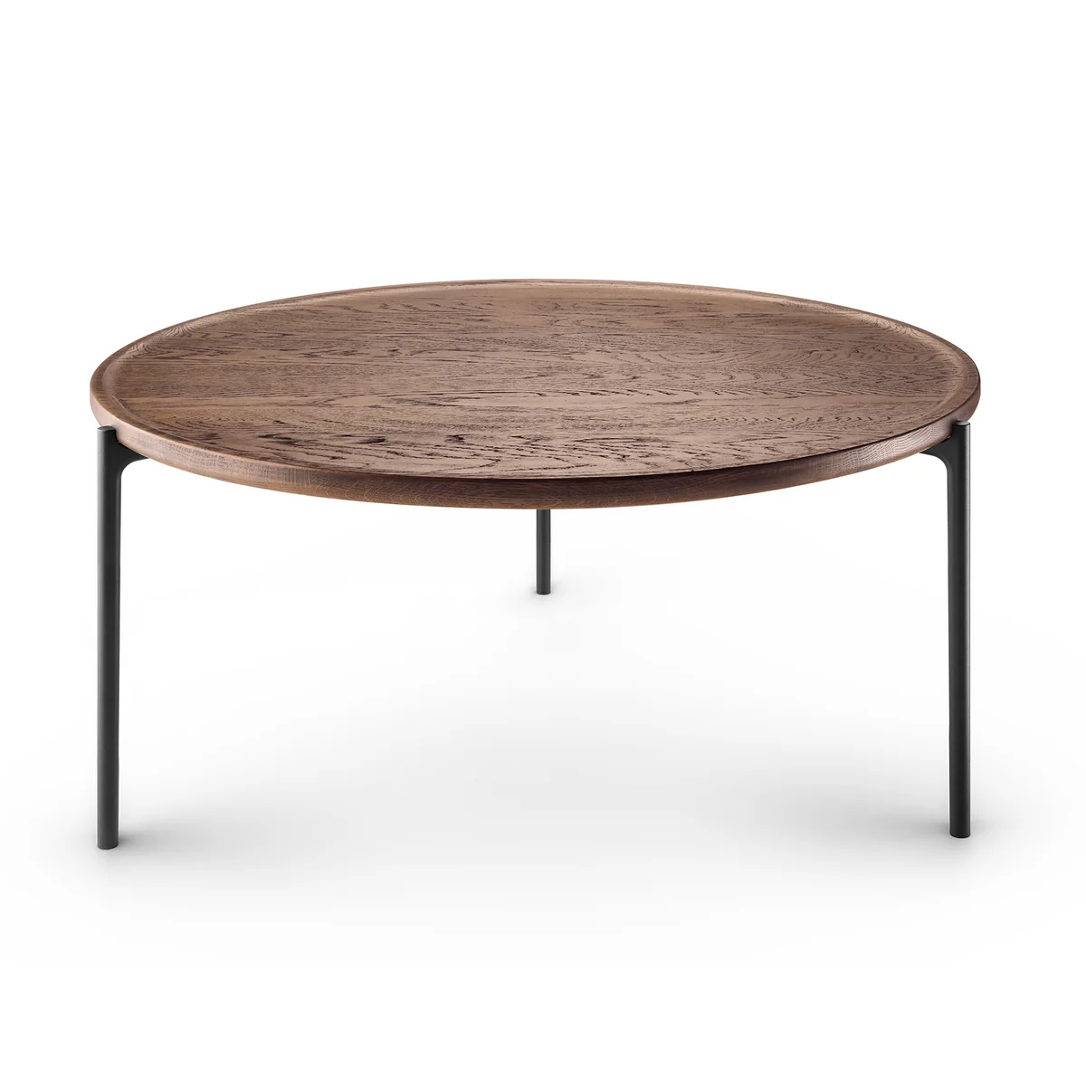 La table peut servir de table basse, de table de rangement ou de table de chevet et offre, avec son plateau rond, suffisamment de place pour des livres, des vases et des décorations. La table est composée d'un plateau en bois de chêne massif et d'un piètement en aluminium noir revêtu par poudre. Le plateau de table rappelle un peu un plateau en raison d'une légère surélévation sur le bord de la table, mais la surélévation a été arrondie de sorte que les miettes et autres peuvent être facilement essuyées.