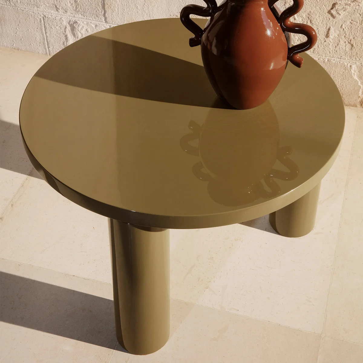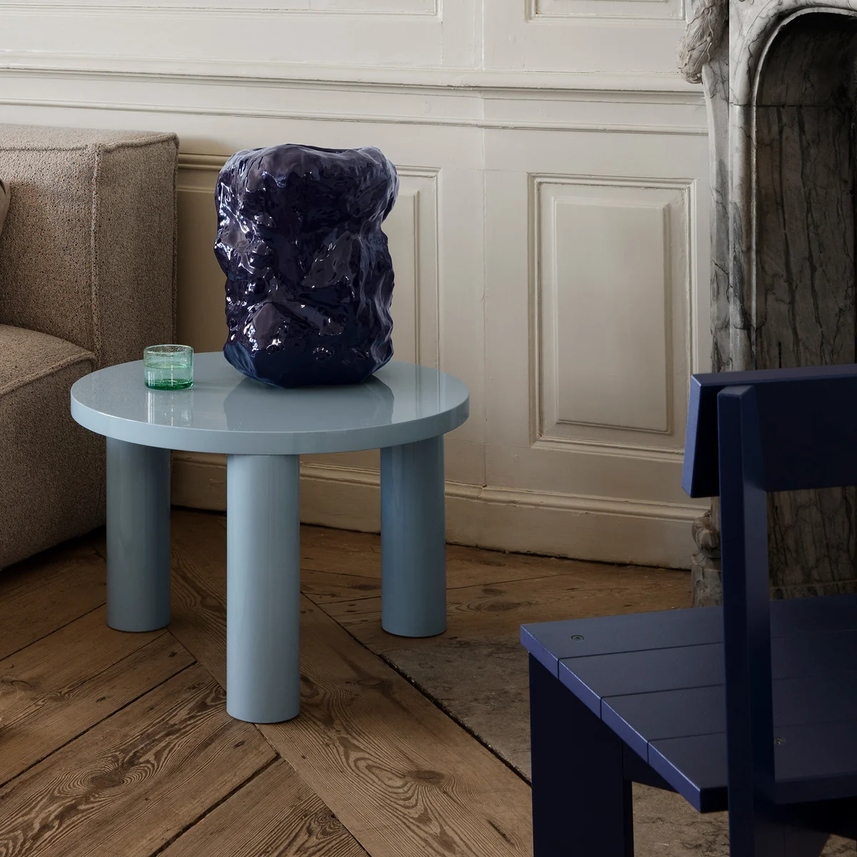 La table Post table basse du fabricant danois Ferm Living s'inspire du brutalisme et offre beaucoup de place avec sa forme ronde et grande. La table basse est fabriquée en bois certifié FSC® et recouverte d'une laque de piano brillante. Trois pieds cylindriques massifs soutiennent le plateau de table robuste.