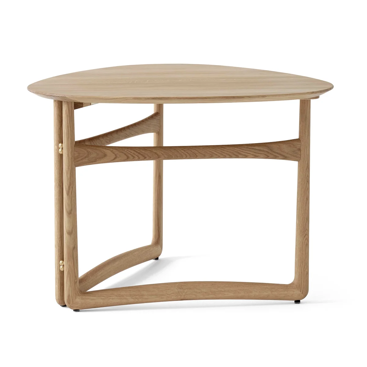 Dans le but de créer un meuble polyvalent qui s'adapte à son environnement, le duo de designers Hvidt & Mølgaard a créé la table basse Drop Leaf HM5 en 1956 par & tradition . Faisant partie de la série Drop Leaf avec des plateaux en forme de feuille, la table basse a les mêmes cadres en bois courbés que la grande table à manger et un design facilement pliable. Ainsi, la table basse devant le canapé ou le fauteuil du salon attire le regard et peut être pliée de manière compacte et facile en cas de besoin.