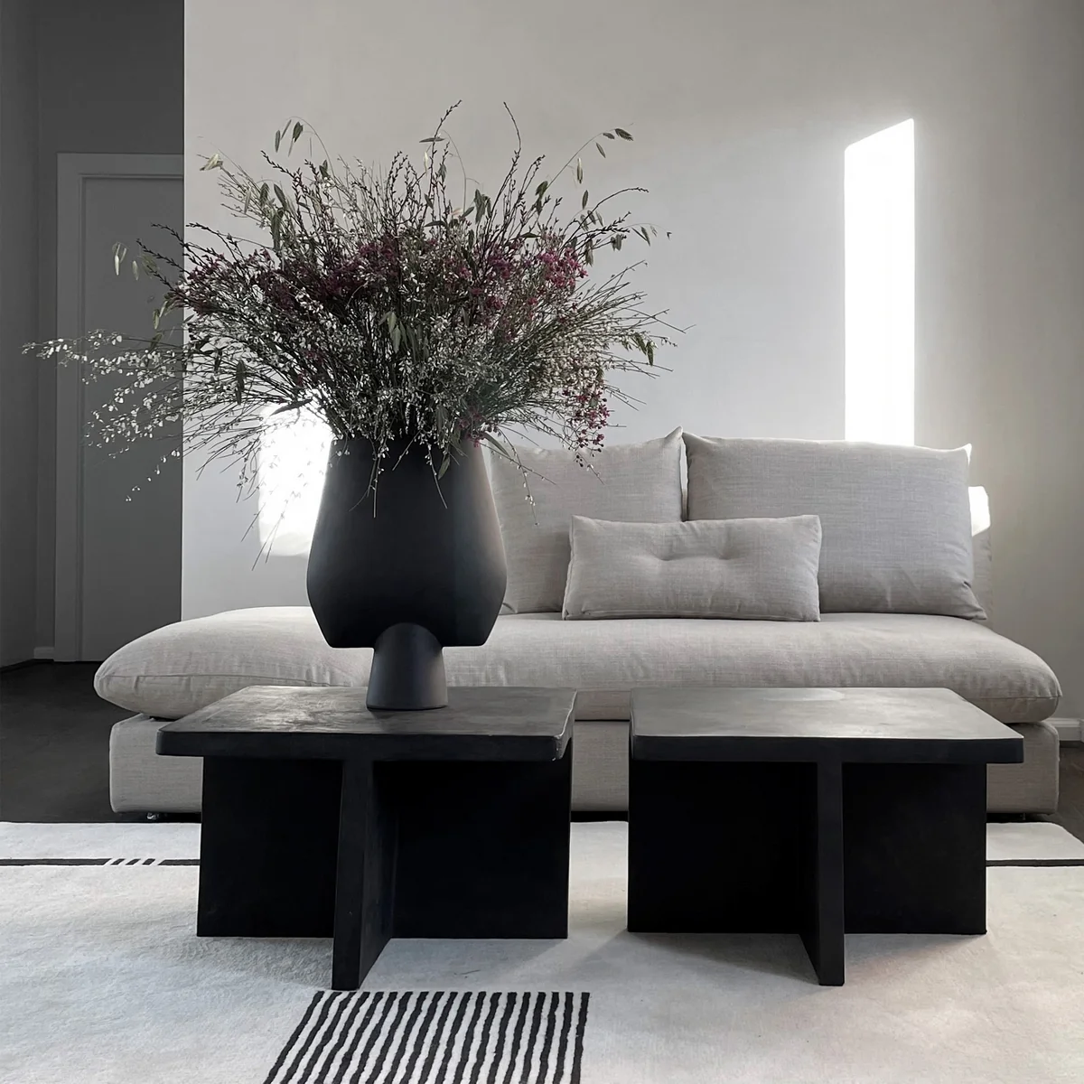 La table d'appoint Brutus s'inspire du mouvement architectural brutaliste du milieu du siècle 20. . Chaque pièce est conçue comme une structure simplifiée en forme de bloc, qui rappelle les éléments de construction architecturaux en béton. Et ce n'est pas tout : la table est moulée en béton fibré léger, ce qui crée une structure de surface unique et augmente la mobilité. Chaque pièce est peinte à la main avec plusieurs couches de peinture, ce qui crée une surface unique et structurée.