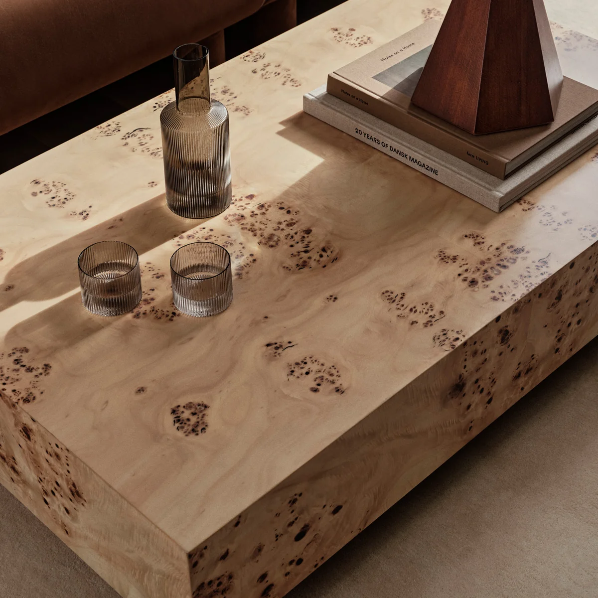 La Burl Coffee Table de Ferm Living présente un plateau de table en bois de burl, connu pour ses veines distinctives et ses formes organiques. Chaque plateau de table est unique et souligne la beauté de la nature.