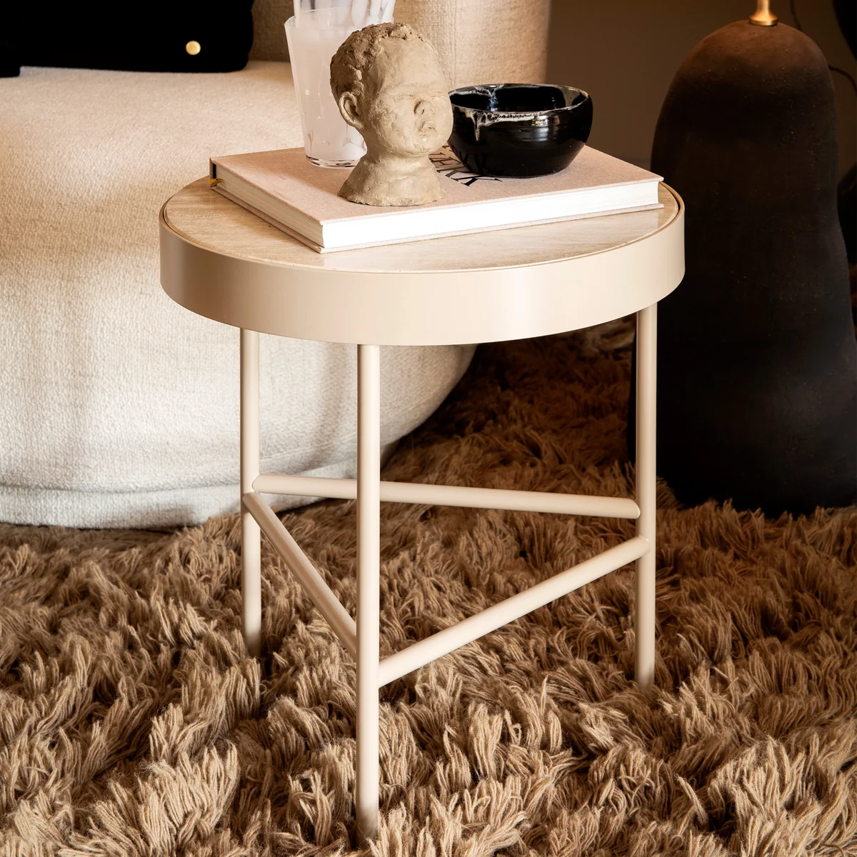 Le Travertine La table basse de Ferm Living est un objet de design noble qui fera sensation partout dans la maison. Son cadre triangulaire en acier contraste avec le plateau rond en pierre calcaire de travertin massif, ce qui fait de cette table un meuble unique. Vases, livres de table basse, mais aussi plantes sont idéalement mis en scène sur le plateau en pierre naturelle.