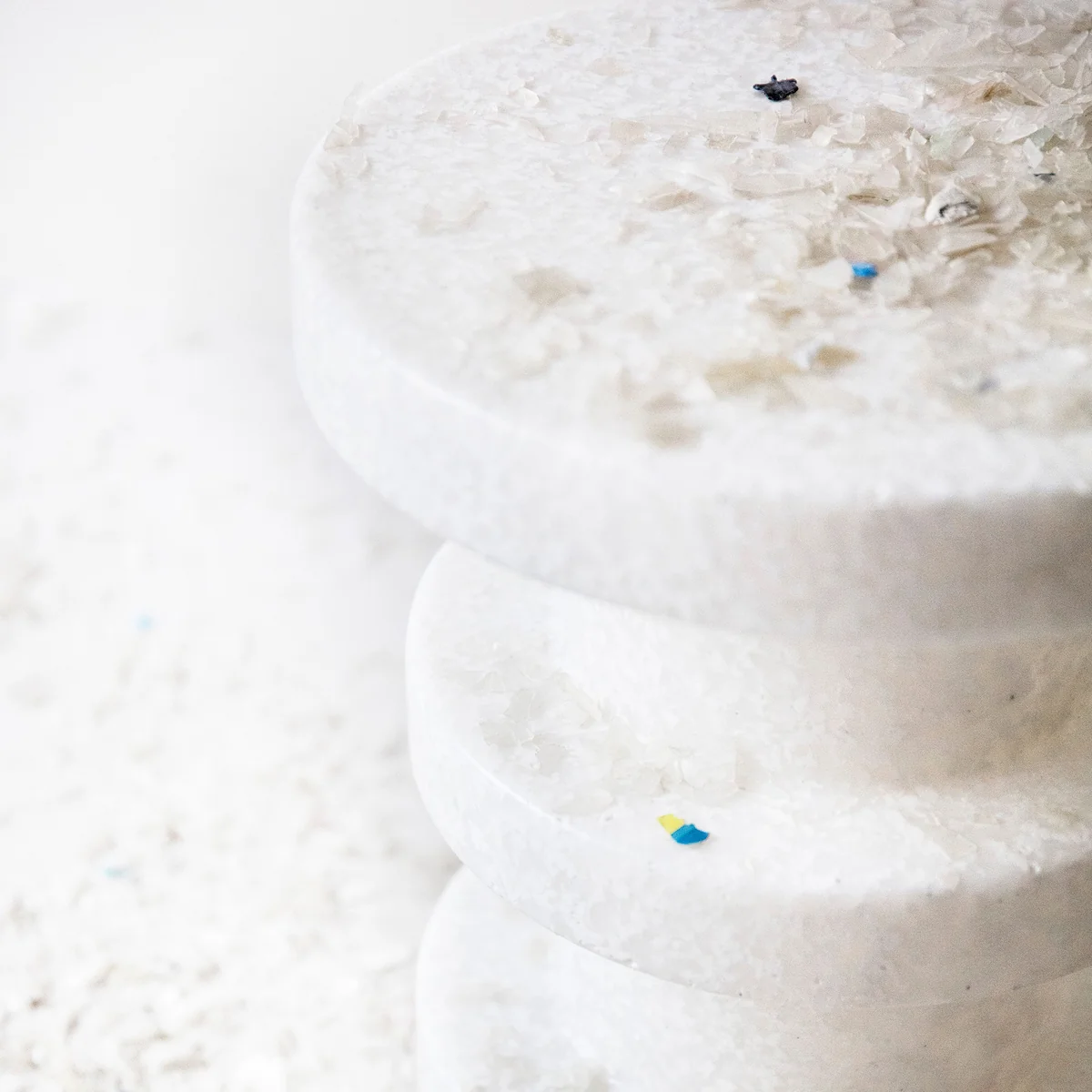 Grâce à un procédé spécial, des morceaux de plastique sont chauffés à 120 degrés jusqu'à leur point de fusion, ce qui permet de les recycler de nombreuses fois sans que le plastique ne perde ses propriétés. C'est ainsi que naît la structure particulière de la table, qui est disponible en différentes variantes.